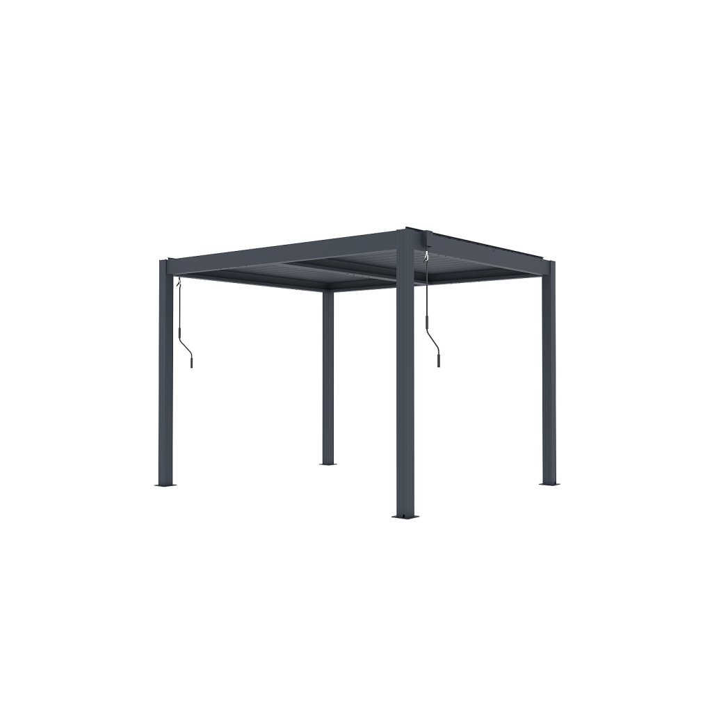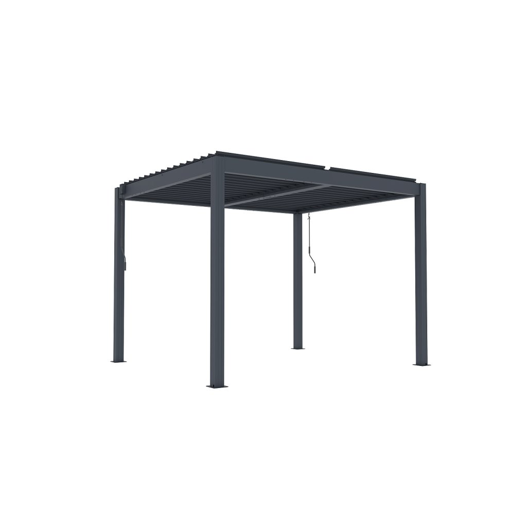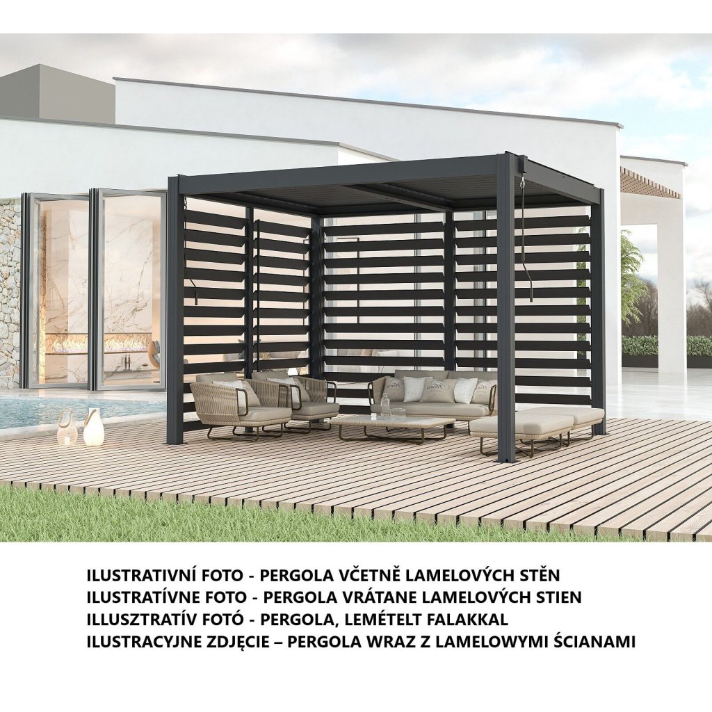Volně stojící bioklimatická pergola LANITPLAST BASIC o rozměrech 3 x 2,5 metru je praktickým a elegantním řešením pro zastřešení venkovního posezení na Vaší zahradě. Robustní a stabilní konstrukce v moderním antracitovém odstínu RAL 7016 s matnou povrchovou úpravou se snadno začlení do jakéhokoliv prostředí a nevyžaduje kotvení do stěny. Sloupy i nosné profily jsou vyrobeny z hliníku a otočné lamely z kvalitní oceli, vše je opatřené vypalovaným práškovým lakem (komaxit). Střešní lamely z pozinkované oceli jsou rovněž opatřeny práškovou barvou, která zajišťuje vysokou odolnost vůči povětrnostním podmínkám. Celkem 32 otočných lamel poskytuje spolehlivou ochranu před slunečními paprsky i deštěm. Jejich sklon lze plynule nastavit od zcela uzavřené polohy (0°) až po plné otevření v úhlu 90°. Ovládání lamel je manuální a probíhá pomocí praktické kličky, která je konstruována tak, aby bylo možné ji naklonit a zabránit tak poškození povrchu pergoly při manipulaci. Její umístění navíc umožňuje bezproblémové používání dalších doplňků, jako jsou boční zástěny nebo moskytiéry, aniž by omezovala jejich funkčnost.
