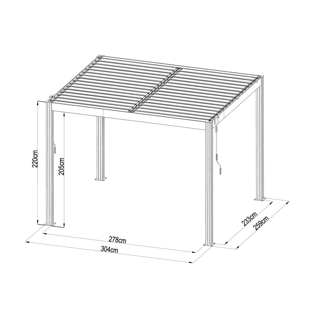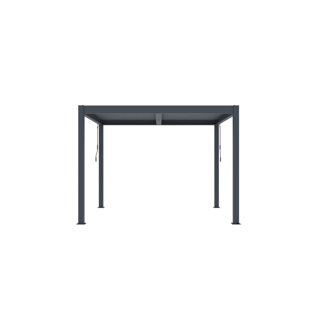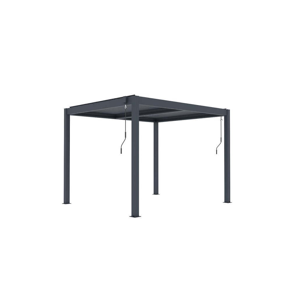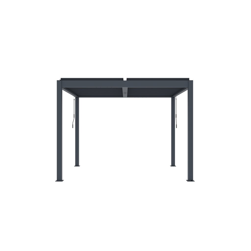 Volně stojící bioklimatická pergola LANITPLAST BASIC o rozměrech 3 x 2,5 metru je praktickým a elegantním řešením pro zastřešení venkovního posezení na Vaší zahradě. Robustní a stabilní konstrukce v moderním antracitovém odstínu RAL 7016 s matnou povrchovou úpravou se snadno začlení do jakéhokoliv prostředí a nevyžaduje kotvení do stěny. Sloupy i nosné profily jsou vyrobeny z hliníku a otočné lamely z kvalitní oceli, vše je opatřené vypalovaným práškovým lakem (komaxit). Střešní lamely z pozinkované oceli jsou rovněž opatřeny práškovou barvou, která zajišťuje vysokou odolnost vůči povětrnostním podmínkám. Celkem 32 otočných lamel poskytuje spolehlivou ochranu před slunečními paprsky i deštěm. Jejich sklon lze plynule nastavit od zcela uzavřené polohy (0°) až po plné otevření v úhlu 90°. Ovládání lamel je manuální a probíhá pomocí praktické kličky, která je konstruována tak, aby bylo možné ji naklonit a zabránit tak poškození povrchu pergoly při manipulaci. Její umístění navíc umožňuje bezproblémové používání dalších doplňků, jako jsou boční zástěny nebo moskytiéry, aniž by omezovala jejich funkčnost.