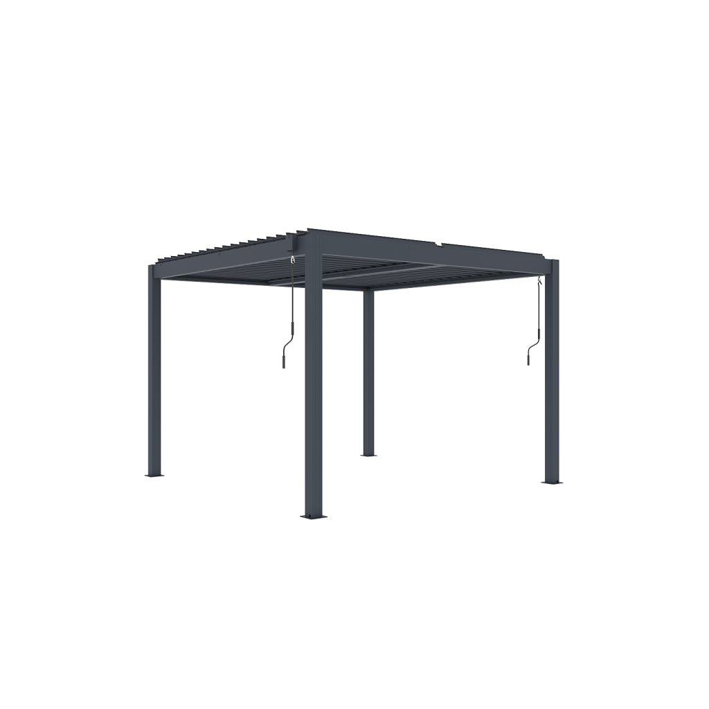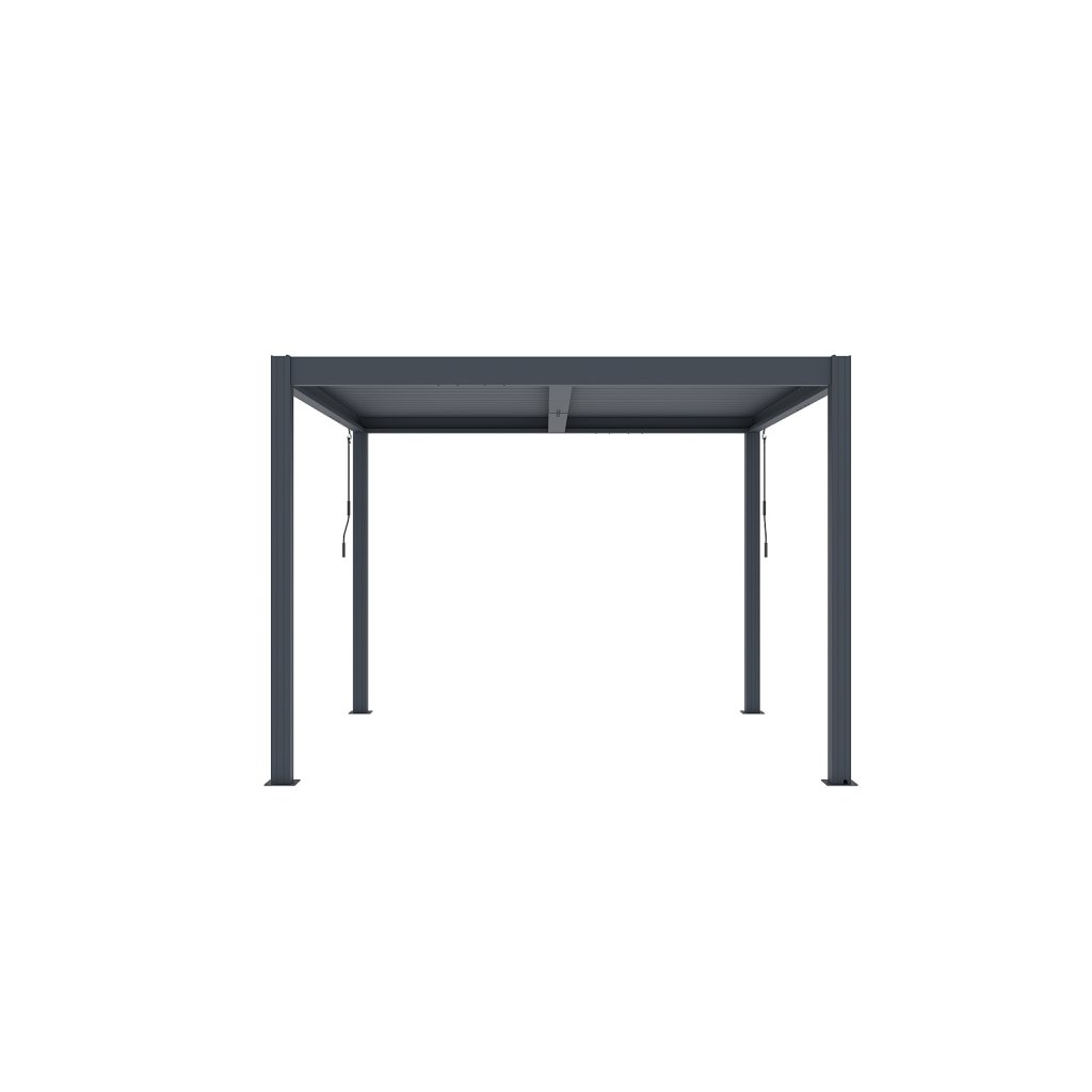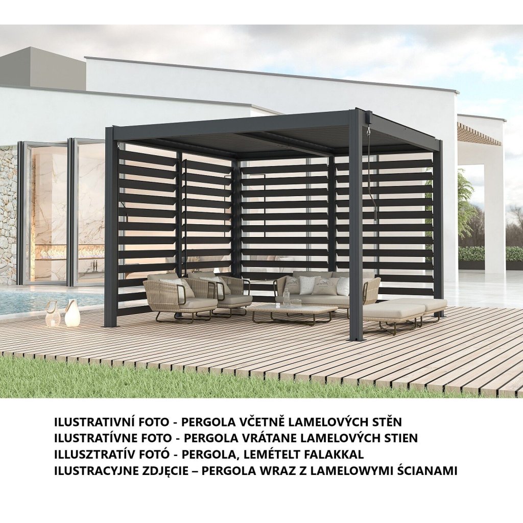 Volně stojící bioklimatická pergola LANITPLAST BASIC o rozměrech 3 x 3 metru je praktickým a elegantním řešením pro zastřešení venkovního posezení na Vaší zahradě. Robustní a stabilní konstrukce v moderním antracitovém odstínu RAL 7016 s matnou povrchovou úpravou se snadno začlení do jakéhokoliv prostředí a nevyžaduje kotvení do stěny. Sloupy i nosné profily jsou vyrobeny z hliníku a otočné lamely z kvalitní oceli, vše je opatřené vypalovaným práškovým lakem (komaxit). Střešní lamely z pozinkované oceli jsou rovněž opatřeny práškovou barvou, která zajišťuje vysokou odolnost vůči povětrnostním podmínkám. Celkem 38 otočných lamel poskytuje spolehlivou ochranu před slunečními paprsky i deštěm. Jejich sklon lze plynule nastavit od zcela uzavřené polohy (0°) až po plné otevření v úhlu 90°. Ovládání lamel je manuální a probíhá pomocí praktické kličky, která je konstruována tak, aby bylo možné ji naklonit a zabránit tak poškození povrchu pergoly při manipulaci. Její umístění navíc umožňuje bezproblémové používání dalších doplňků, jako jsou boční zástěny nebo moskytiéry, aniž by omezovala jejich funkčnost.