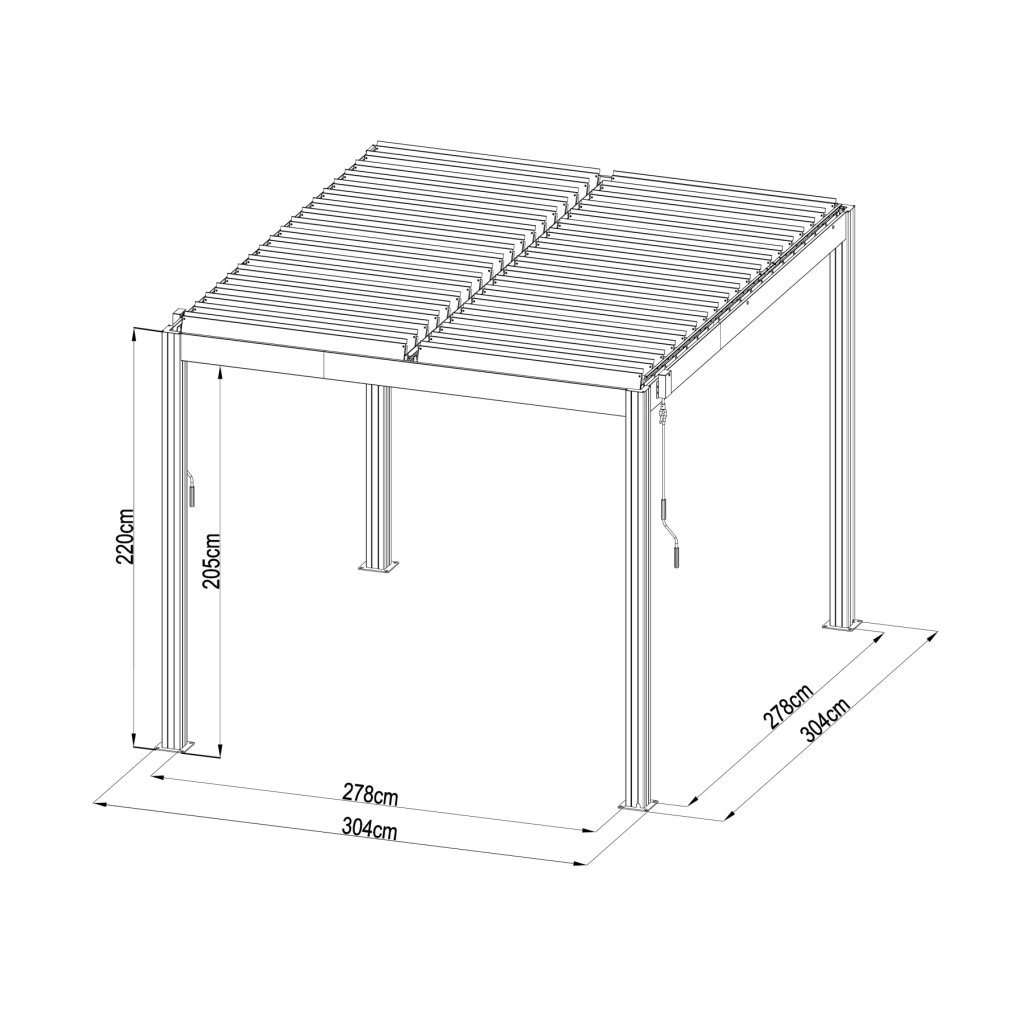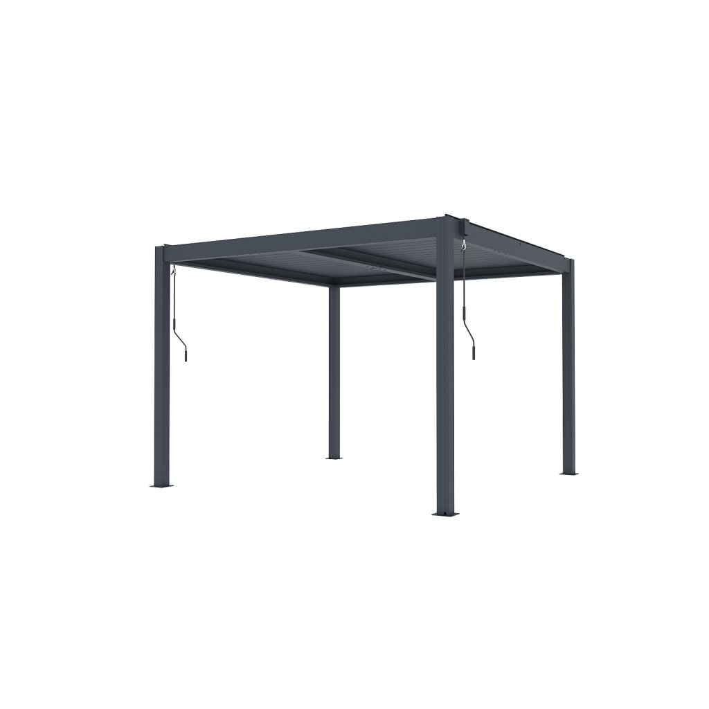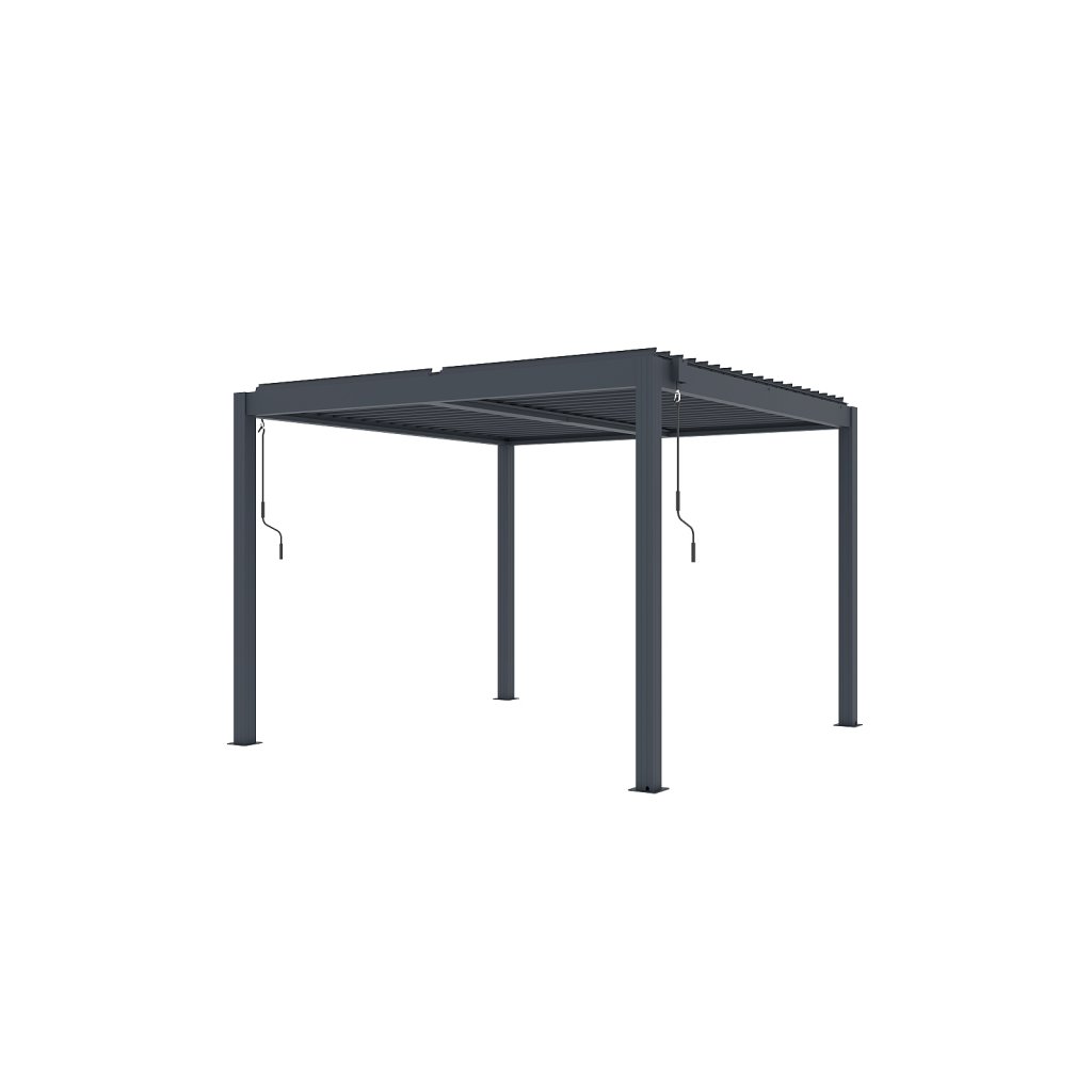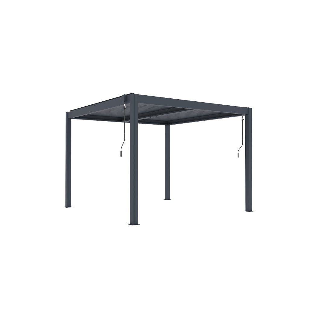 Volně stojící bioklimatická pergola LANITPLAST BASIC o rozměrech 3 x 3 metru je praktickým a elegantním řešením pro zastřešení venkovního posezení na Vaší zahradě. Robustní a stabilní konstrukce v moderním antracitovém odstínu RAL 7016 s matnou povrchovou úpravou se snadno začlení do jakéhokoliv prostředí a nevyžaduje kotvení do stěny. Sloupy i nosné profily jsou vyrobeny z hliníku a otočné lamely z kvalitní oceli, vše je opatřené vypalovaným práškovým lakem (komaxit). Střešní lamely z pozinkované oceli jsou rovněž opatřeny práškovou barvou, která zajišťuje vysokou odolnost vůči povětrnostním podmínkám. Celkem 38 otočných lamel poskytuje spolehlivou ochranu před slunečními paprsky i deštěm. Jejich sklon lze plynule nastavit od zcela uzavřené polohy (0°) až po plné otevření v úhlu 90°. Ovládání lamel je manuální a probíhá pomocí praktické kličky, která je konstruována tak, aby bylo možné ji naklonit a zabránit tak poškození povrchu pergoly při manipulaci. Její umístění navíc umožňuje bezproblémové používání dalších doplňků, jako jsou boční zástěny nebo moskytiéry, aniž by omezovala jejich funkčnost.