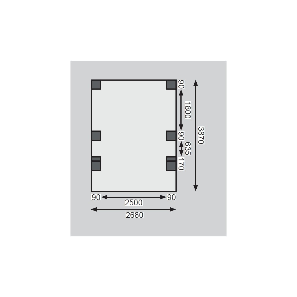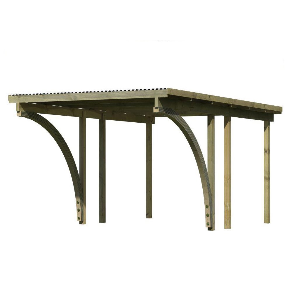 Přístřešek na auto - obdélníkový tvar a svými rozměry vyhovuje řadě modelů vozidel běžných na českém trhu (nutno ověřit velikost vozu). Celková zastřešená plocha je 3,04 x 4,90 m. Průjezdná výška je 206 cm. Střechu podpírá šest dřevěných sloupků 9 x 9 cm. Konstrukce přístřešku je tlakově impregnována a je tak dobře chráněna proti dřevokazným houbám i hmyzu, ale i proti nepříznivým povětrnostním podmínkám. Impregnace je zdravotně nezávadná a naprosto bezpečná. Vzhledem k velkým plochám střechy a zatížení větrem je nutné připevnit přístřešek k zemi pomocí odpovídajících zemních kotev (nejsou obsahem dodávky - lze dokoupit jako příplatkové příslušenství).