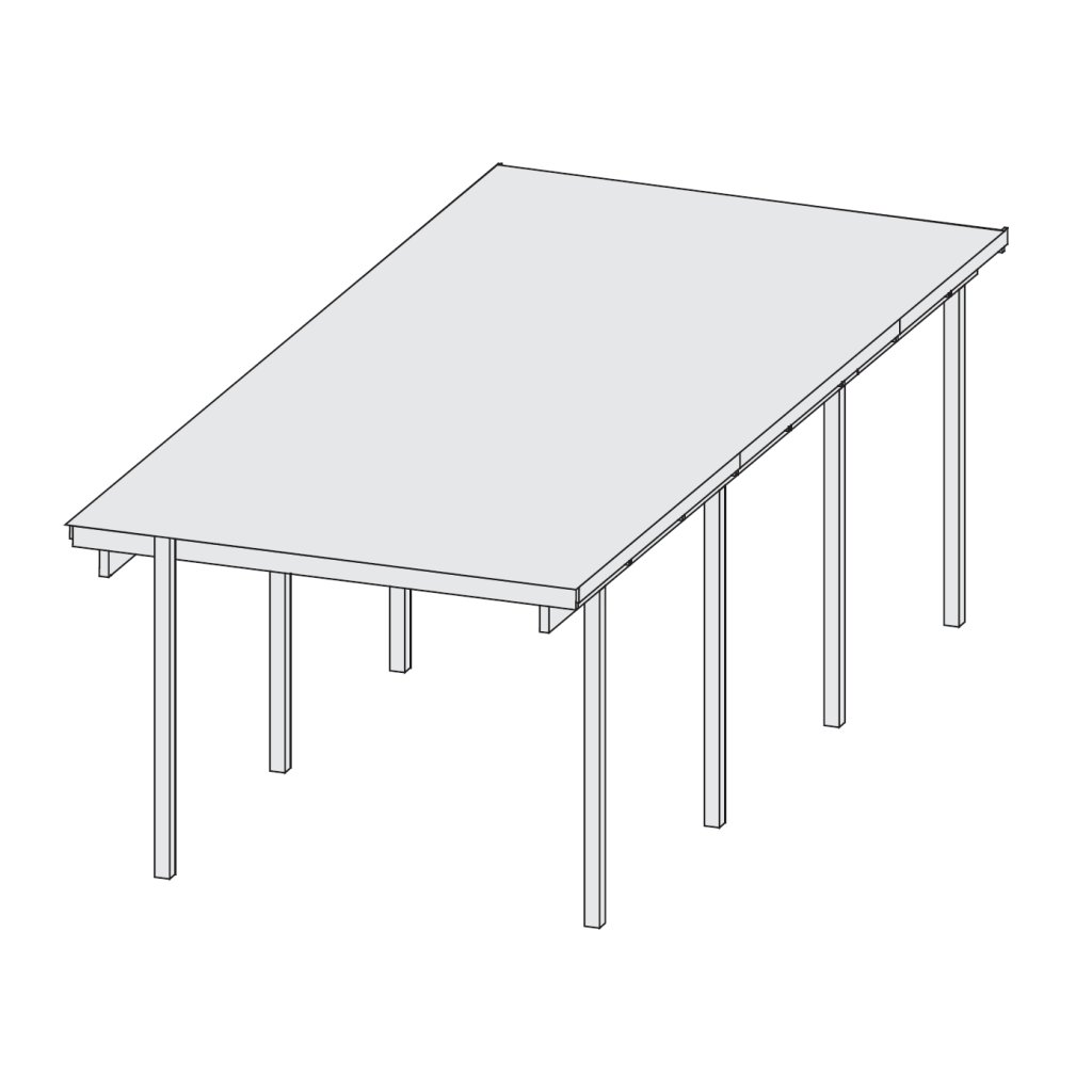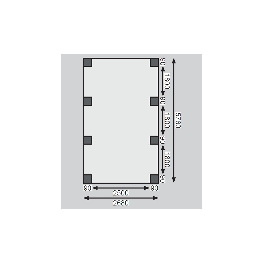 Přístřešek na auto - obdélníkový tvar a svými rozměry vyhovuje většině modelů vozidel běžných na českém trhu. Celková zastřešená plocha je 3,04 x 6,76 m. Průjezdná výška je 206 cm. Střechu podpírá osm dřevěných sloupků 9 x 9 cm. Konstrukce přístřešku je tlakově impregnována a je tak dobře chráněna proti dřevokazným houbám i hmyzu, ale i proti nepříznivým povětrnostním podmínkám. Impregnace je zdravotně nezávadná a naprosto bezpečná. Vzhledem k velkým plochám střechy a zatížení větrem je nutné připevnit přístřešek k zemi pomocí odpovídajících zemních kotev (nejsou obsahem dodávky - lze dokoupit jako příplatkové příslušenství).