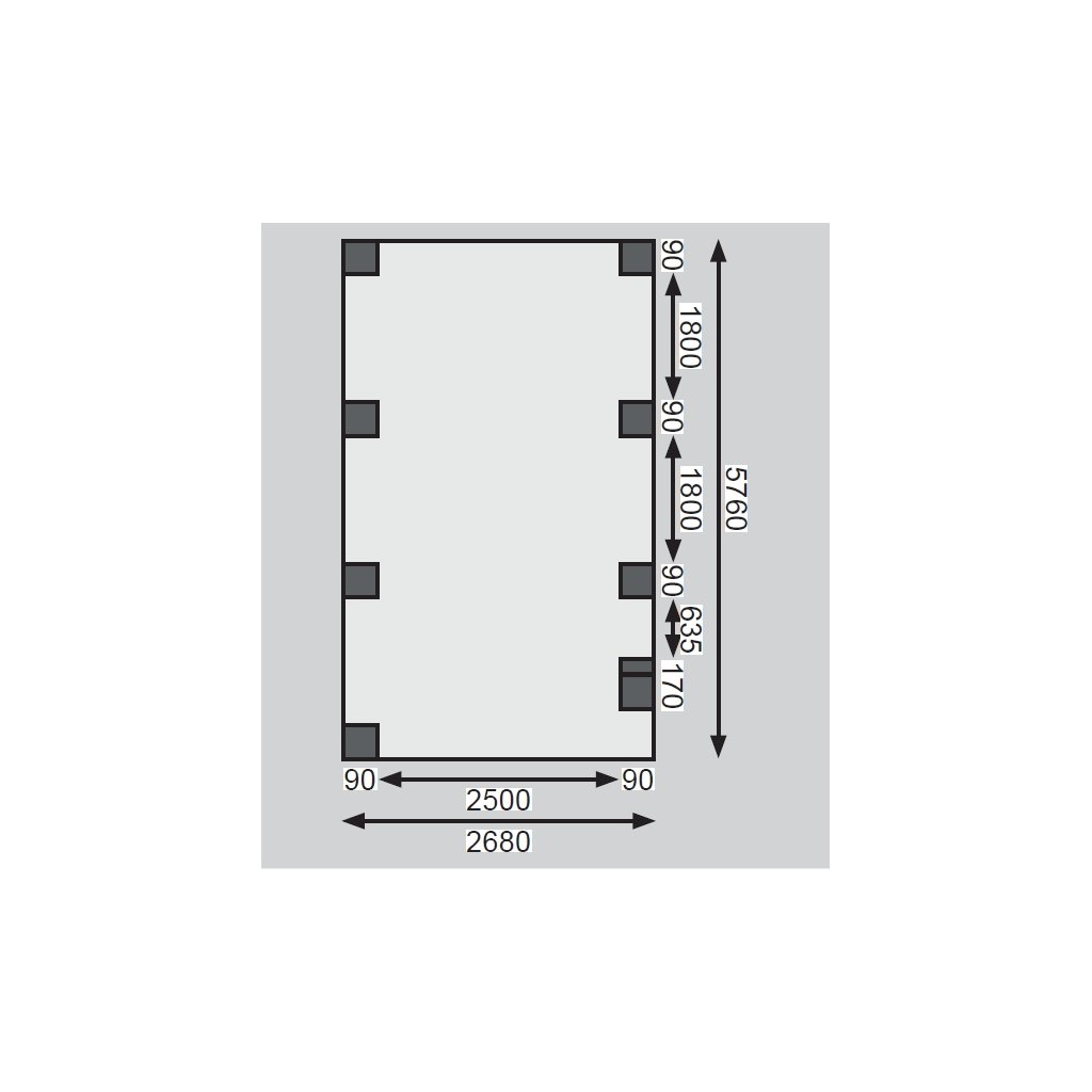Přístřešek má obdélníkový tvar a svými rozměry vyhovuje většině modelů vozidel běžných na českém trhu. Celková zastřešená plocha je 3,04 x 6,76 m. Průjezdná výška je 206 cm. Střechu podpírá osm dřevěných sloupků 9 x 9 cm. Konstrukce přístřešku je tlakově impregnována a je tak dobře chráněna proti dřevokazným houbám i hmyzu, ale i proti nepříznivým povětrnostním podmínkám. Impregnace je zdravotně nezávadná a naprosto bezpečná. Vzhledem k velkým plochám střechy a zatížení větrem je nutné připevnit přístřešek k zemi pomocí odpovídajících zemních kotev (nejsou obsahem dodávky - lze dokoupit jako příplatkové příslušenství).
