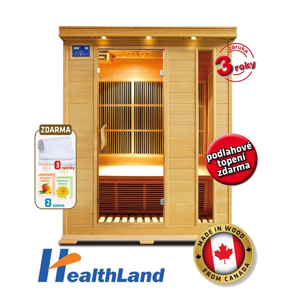AKCE: Podlahové topení + 3x ručník +2x vonná esence - vše ZDARMA !!!!! Počet osob: 3 Výkon: 2000 W / podlahové karbonové topení Osvětlení: Vnitřní LED Rampa: LED osvětlení Rádio: AM/FM/MP3/USB/SD/Bluetooth Příprava pro MP5: ANO Digitální ovládací panel: ANO vnitří i venkovní Barevná terapie: volitelné příslušenství - na dokoupení Topná tělesa: 9x karbonová Podlahové topení: ANO Vlnová délka: 5,6-15 ?m Polička na nápoje: ANO Teplotní senzor: ANO Dřevo: kanadský jedlovec Ionizátor: ANO (citronová esence) Dveře: tvrzené bezpečnostní sklo Šířka venkovní: 1500 mm Výška venkovní: 1900 mm Délka venkovní : 1200 mm Hmotnost: 147 kg Záruka: 3 roky INFRASAUNA HEALTHLAND DeLUXE 3003 CARBON Novinka pro modelovou řadu 2018 - přídavná barevná terapie jako volitelné příslušenství na dokoupení. Přídavná barevná terapie je určena pro infrasauny značky HealthLand od roku výroby 2018. Doporučená MOC barevné terapie je 1.990 Kč s DPH. ENERGETICKY NENÁROČNÉ Provozní náklady jsou u infrasauny nesrovnatelně nižší než u klasické sauny. Provoz infrasauny je výrazně úspornější , hlavním důvodem jsou úsporné keramické nebo karbonové zářiče, infrasauna se nemusí předehřívat jako běžná sauna, provozní teplota v infrasauně je nižší (pocitová teplota je zhruba dvojnásobná). Díky efektivnímu způsobu využití infračerveného záření, které proniká hluboko do tkáně, není zapotřebí vytápět infrasaunu do tak vysoké teploty, jako je tomu u běžné klasické sauny. Infrasauny jsou energeticky nenáročné spotřebiče , náklady na energii se pohybují v závislosti na velikosti infrasauny pro každý Váš pobyt v infrasauně okolo 4 - 8 Kč. Záleží na velikosti a kapacitě infrasauny, čím větší infrasauna, tím vyšší výkon potřebuje. Níže naleznete tabulku uvádějící průměrnou spotřebu a přibližnou cenu za saunovací cyklus daného typu infrasauny. O jaké záření se tedy jedná a co to vlastně je to infračervené záření? Infrasauny jsou zcela bezpečná zařízení, jejichž záření nemá nic společného s UV zářením ani se zářením nukleárním. Infračervené (jinak také nazývané tepelné) záření – je záření o vlnové délce větší, než je vlnová délka viditelného světla. Infračervené paprsky tedy nevidíme, ale vnímáme je jako teplo. Jedná se o podobný princip, jako když Slunce ohřívá Zemi. Toto „zářící teplo“, zahřívá tělesa přímo, aniž by docházelo k zahřívání okolního vzduchu „Saunování“ v infračervené kabině je založeno na principu emise infračerveného záření speciálními karbonovými a keramickými zářiči, které si nechal patentovat dr. Tadaschi Ishikawa v Japonsku již v roce 1965. Toto infračervené záření prohřeje tělo hluboko do svalové tkáně a k intenzivnímu pocení tak dochází již při teplotě okolo 50 °C v prostředí, které nezatěžuje organismus. Po celou dobu pobytu v kabině dýcháte vzduch o teplotě 20 až 55 °C, protože 80–90 % vyzařovaného tepla vstřebá vaše tělo a jen zbytek se rozptýlí do prostoru kabiny. To je zásadní rozdíl mezi klasickou saunou a infrasaunou. Infrasauna je integrované, multifunkční a luxusní zařízení pro léčbu i relaxaci, která společně se saunou zahrnuje v sobě též výhody sluneční lázně. Infračervený paprsek je jejím hlavním zdrojem energie. Vlnová délka infračerveného paprsku je 5,6 – 15 µm a je tělem nejlépe absorbována. Infračervený paprsek může proniknout 40 mm hluboko do lidské kůže, tím dochází k resonanci buněčných tkání v těle, zrychlení krevního oběhu a odstranění nečistot z těla. Proto má sauna velmi dobrý vliv na zdraví. Infrasauny s carbonovým topidlem vyzařují infračervený paprsek v širším spektru než infrasauny s keramickým topidlem. Infrasauny jsou vhodné pro osoby, které se léčí s krevním tlakem, nebo těžce snášejí vysokou teplotu v klasické sauně. Výhody Carbonových infrasaun HealthLand Vyhání z těla jedovaté látky – detoxikace. Toxiny, stejně jako sodík, alkohol, nikotin, karcinogenní těžké kovy a rtuť se postupně hromadí v lidském těle. Infračervené teplo stimuluje potní žlázy, aby pročišťovaly a detoxikovali pokožku. Redukuje stres – Infračervené teplo uvolňuje svaly a uvolňuje tělo např. před masáží. Hodně masérů používá infračervené teplo k většímu a hlubšímu prožitku z masáže. Prospívá Vaší kůži – Infračervené teplo zlepšuje oběh, vylučuje nečistotu a chemikálie aodstraňuje odumřelé kožní buňky. To vše zpevňuje Vaši pokožku a zmírňuje vytváření vrásek. Snižuje váhu – součástí termoregulačního procesu lidského těla je pocení v důsledku zvýšení srdeční frekvence a zrychlení metabolismu. Tělo poté začne vylučovat nadbytečnou vlhkost, soli a podkožní tuky. Tuky se vylučují z těla při teplotě 42°C, když se tělo potí a vylučují se zněj škodlivé látky. Vhodný doplněk pro redukci váhy. Za 30 min. spálí až 600 cal. Úleva od bolesti – infračervené teplo ulevuje od bolesti tím, že se v těle rozšiřují krevní cévy a zrychluje oběh, kterým pak proudí více kyslíku, rychleji se dostává k poraněným místům a urychluje hojení ran a poranění. Mnoho lidí používá infračervené světlo pro léčbu artrózy, svalového spazmu a revmatismu. Stejné výsledky, jako při cvičení – při 20 – 30 minutovém pobytu v infrasauně srdce vydá ten stejný výkon jako při běhu na 9 km. Infrasauny jsou vhodné pro ty, kteří nemají čas na cvičení nebo nemohou cvičit kvůli různým zraněním. Zlepšuje imunitní systém – při horečce stoupá tělesná teplota a tělo se tak brání virům. Při používání infrasauny se tělo lépe brání díky v
