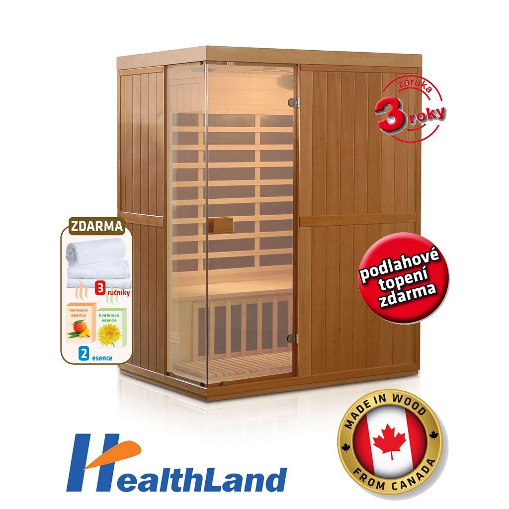 AKCE: Podlahové topení + 3x ručník +2x vonná esence - vše ZDARMA !!!!! Počet osob: 3 Výkon: 2000 W / podlahové karbonové topení Osvětlení: Vnitřní LED Rádio: AM/FM/MP3/USB/SD/Bluetooth Příprava pro MP5: ANO Digitální ovládací panel: ANO vnitří Barevná terapie: volitelné příslušenství - na dokoupení Topná tělesa: 8x karbonová Podlahové topení: ANO Vlnová délka: 5,6-15 ?m Polička na nápoje: ANO 2x Teplotní senzor: ANO Dřevo: kanadský jedlovec Ionizátor: ANO (citronová esence) Dveře: tvrzené bezpečnostní sklo Šířka venkovní: 1500 mm Výška venkovní: 1900 mm Délka venkovní : 1100 mm Hmotnost: 125 kg Záruka: 3 roky INFRASAUNA HEALTHLAND DeLUXE 3300 CARBON Novinka pro modelovou řadu 2018 - přídavná barevná terapie jako volitelné příslušenství na dokoupení. Přídavná barevná terapie je určena pro infrasauny značky HealthLand od roku výroby 2018. Doporučená MOC barevné terapie je 1.990 s DPH. ENERGETICKY NENÁROČNÉ Provozní náklady jsou u infrasauny nesrovnatelně nižší než u klasické sauny. Provoz infrasauny je výrazně úspornější , hlavním důvodem jsou úsporné keramické nebo karbonové zářiče, infrasauna se nemusí předehřívat jako běžná sauna, provozní teplota v infrasauně je nižší (pocitová teplota je zhruba dvojnásobná). Díky efektivnímu způsobu využití infračerveného záření, které proniká hluboko do tkáně, není zapotřebí vytápět infrasaunu do tak vysoké teploty, jako je tomu u běžné klasické sauny. Infrasauny jsou energeticky nenáročné spotřebiče , náklady na energii se pohybují v závislosti na velikosti infrasauny pro každý Váš pobyt v infrasauně okolo 4 - 8 Kč. Záleží na velikosti a kapacitě infrasauny, čím větší infrasauna, tím vyšší výkon potřebuje. Níže naleznete tabulku uvádějící průměrnou spotřebu a přibližnou cenu za saunovací cyklus daného typu infrasauny. O jaké záření se tedy jedná a co to vlastně je to infračervené záření? Infrasauny jsou zcela bezpečná zařízení, jejichž záření nemá nic společného s UV zářením ani se zářením nukleárním. Infračervené (jinak také nazývané tepelné) záření – je záření o vlnové délce větší, než je vlnová délka viditelného světla. Infračervené paprsky tedy nevidíme, ale vnímáme je jako teplo. Jedná se o podobný princip, jako když Slunce ohřívá Zemi. Toto „zářící teplo“, zahřívá tělesa přímo, aniž by docházelo k zahřívání okolního vzduchu „Saunování“ v infračervené kabině je založeno na principu emise infračerveného záření speciálními karbonovými a keramickými zářiči, které si nechal patentovat dr. Tadaschi Ishikawa v Japonsku již v roce 1965. Toto infračervené záření prohřeje tělo hluboko do svalové tkáně a k intenzivnímu pocení tak dochází již při teplotě okolo 50 °C v prostředí, které nezatěžuje organismus. Po celou dobu pobytu v kabině dýcháte vzduch o teplotě 20 až 55 °C, protože 80–90 % vyzařovaného tepla vstřebá vaše tělo a jen zbytek se rozptýlí do prostoru kabiny. To je zásadní rozdíl mezi klasickou saunou a infrasaunou. Infrasauna je integrované, multifunkční a luxusní zařízení pro léčbu i relaxaci, která společně se saunou zahrnuje v sobě též výhody sluneční lázně. Infračervený paprsek je jejím hlavním zdrojem energie. Vlnová délka infračerveného paprsku je 5,6 – 15 µm a je tělem nejlépe absorbována. Infračervený paprsek může proniknout 40 mm hluboko do lidské kůže, tím dochází k resonanci buněčných tkání v těle, zrychlení krevního oběhu a odstranění nečistot z těla. Proto má sauna velmi dobrý vliv na zdraví. Infrasauny s carbonovým topidlem vyzařují infračervený paprsek v širším spektru než infrasauny s keramickým topidlem. Infrasauny jsou vhodné pro osoby, které se léčí s krevním tlakem, nebo těžce snášejí vysokou teplotu v klasické sauně. Výhody Carbonových infrasaun HealthLand Vyhání z těla jedovaté látky – detoxikace. Toxiny, stejně jako sodík, alkohol, nikotin, karcinogenní těžké kovy a rtuť se postupně hromadí v lidském těle. Infračervené teplo stimuluje potní žlázy, aby pročišťovaly a detoxikovali pokožku. Redukuje stres – Infračervené teplo uvolňuje svaly a uvolňuje tělo např. před masáží. Hodně masérů používá infračervené teplo k většímu a hlubšímu prožitku z masáže. Prospívá Vaší kůži – Infračervené teplo zlepšuje oběh, vylučuje nečistotu a chemikálie aodstraňuje odumřelé kožní buňky. To vše zpevňuje Vaši pokožku a zmírňuje vytváření vrásek. Snižuje váhu – součástí termoregulačního procesu lidského těla je pocení v důsledku zvýšení srdeční frekvence a zrychlení metabolismu. Tělo poté začne vylučovat nadbytečnou vlhkost, soli a podkožní tuky. Tuky se vylučují z těla při teplotě 42°C, když se tělo potí a vylučují se zněj škodlivé látky. Vhodný doplněk pro redukci váhy. Za 30 min. spálí až 600 cal. Úleva od bolesti – infračervené teplo ulevuje od bolesti tím, že se v těle rozšiřují krevní cévy a zrychluje oběh, kterým pak proudí více kyslíku, rychleji se dostává k poraněným místům a urychluje hojení ran a poranění. Mnoho lidí používá infračervené světlo pro léčbu artrózy, svalového spazmu a revmatismu. Stejné výsledky, jako při cvičení – při 20 – 30 minutovém pobytu v infrasauně srdce vydá ten stejný výkon jako při běhu na 9 km. Infrasauny jsou vhodné pro ty, kteří nemají čas na cvičení nebo nemohou cvičit kvůli různým zraněním. Zlepšuje imunitní systém – při horečce stoupá tělesná teplota a tělo se tak brání virům. Při používání infrasauny se tělo lépe brání díky vyvolání "umělé horečky". Nejnov