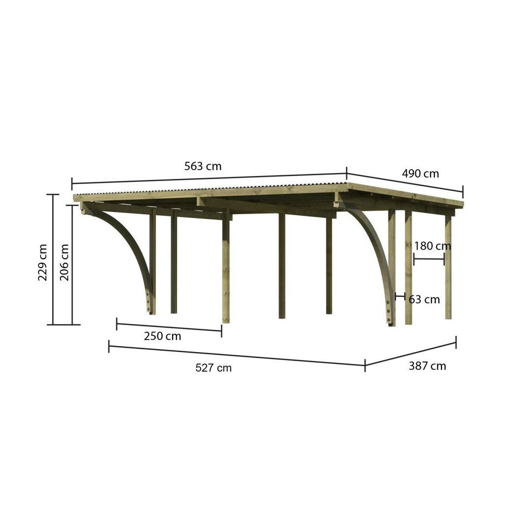 Přístřešek má obdélníkový tvar a svými rozměry vyhovuje většině modelů vozidel běžných na českém trhu. Celková zastřešená plocha je 5,63 x 4,90 m. Průjezdná výška je 206 cm. Střechu podpírá devět dřevěných sloupků 9 x 9 cm. Konstrukce přístřešku je tlakově impregnována a je tak dobře chráněna proti dřevokazným houbám i hmyzu, ale i proti nepříznivým povětrnostním podmínkám. Impregnace je zdravotně nezávadná a naprosto bezpečná. Vzhledem k velkým plochám střechy a zatížení větrem je nutné připevnit přístřešek k zemi pomocí odpovídajících zemních kotev (nejsou obsahem dodávky - lze dokoupit jako příplatkové příslušenství).