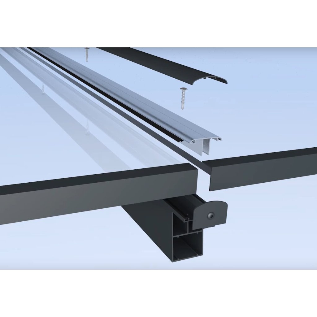 - polykarbonátové desky se připevňují pomocí přítlačné hliníkové lišty a šroubů, krycí lišty jsou v barvě pergoly