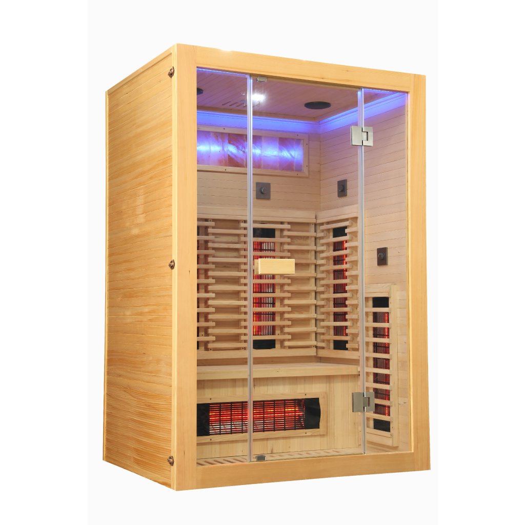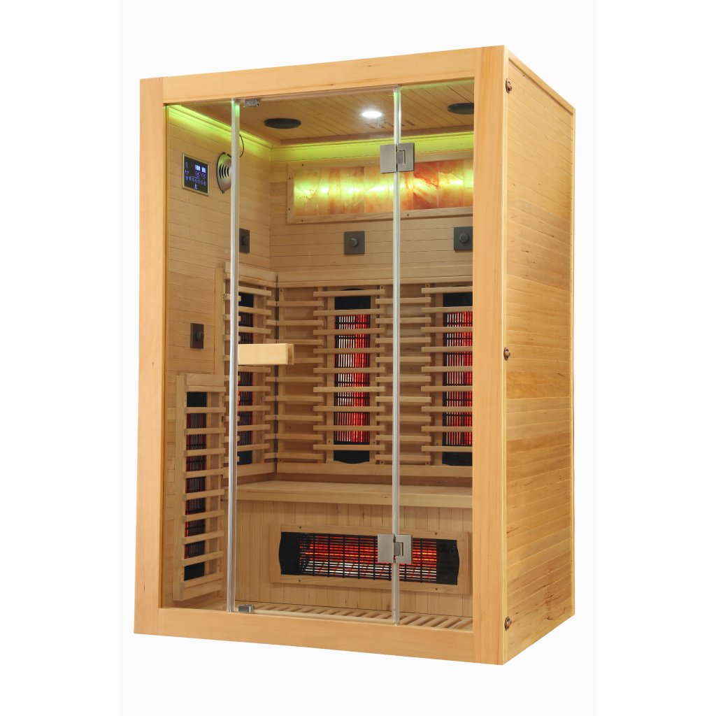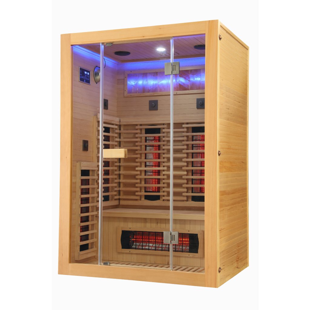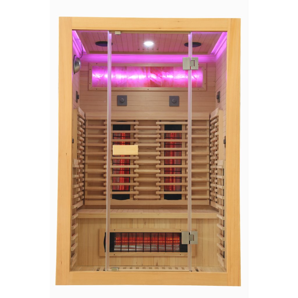 Infrasauna pro 2 osoby, 120x105x190 cm, 7x fullspektrální zářič RedGlass s možností výměny za zářiče Vitae 350W ( 2x záda, 4x boční, 1x lýtkový )+ 1x podlahový karbonový zářič, regulace výkonu zářičů, Hemlock, MP3, Bluetooth, Světelná terapie,Solná terapie ionizátor