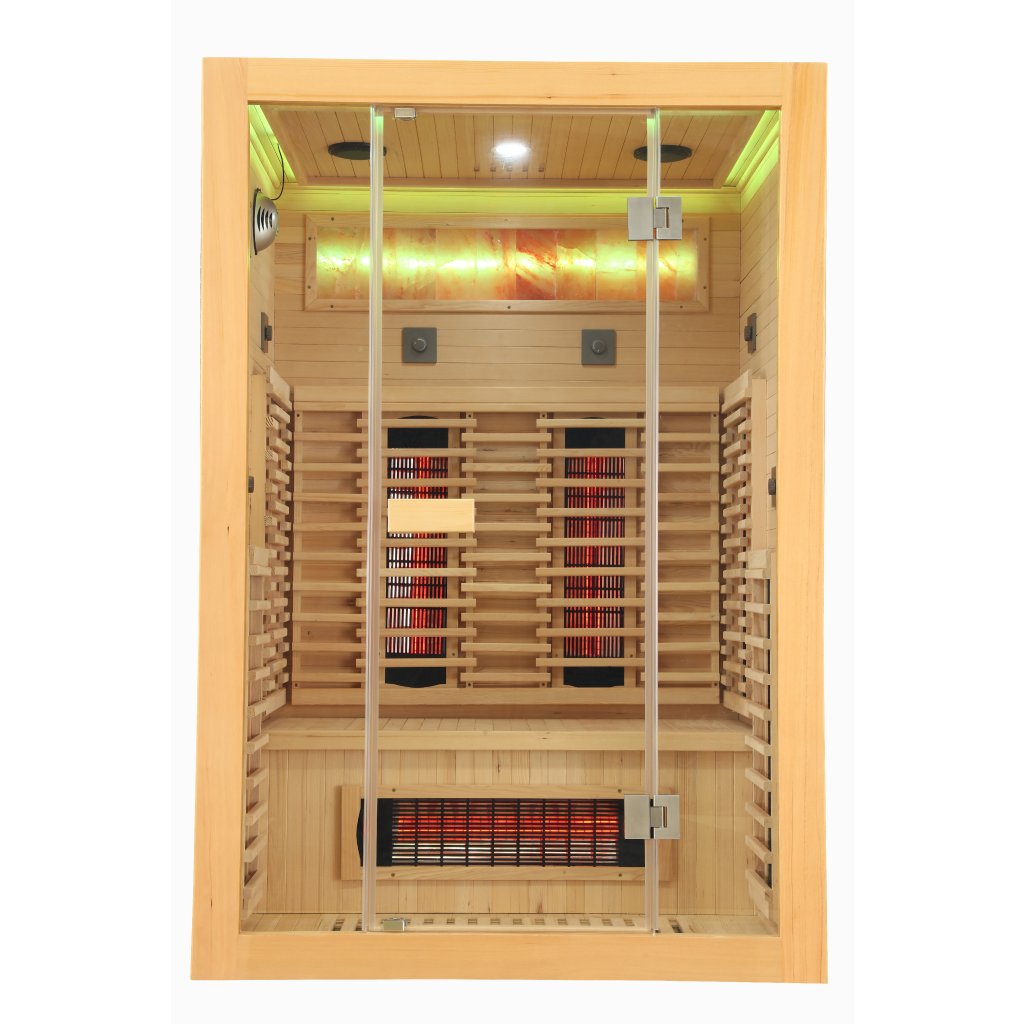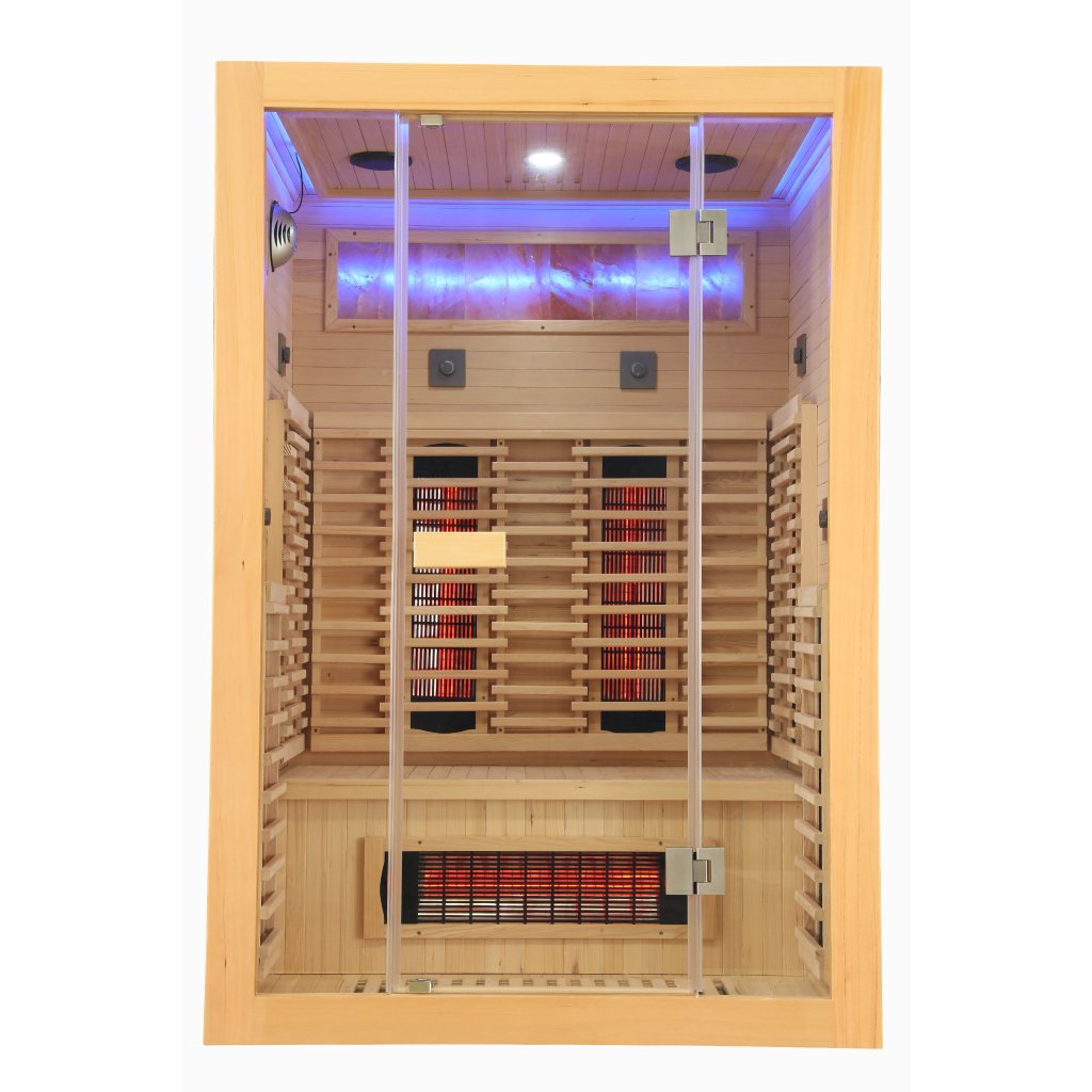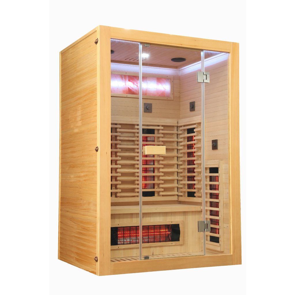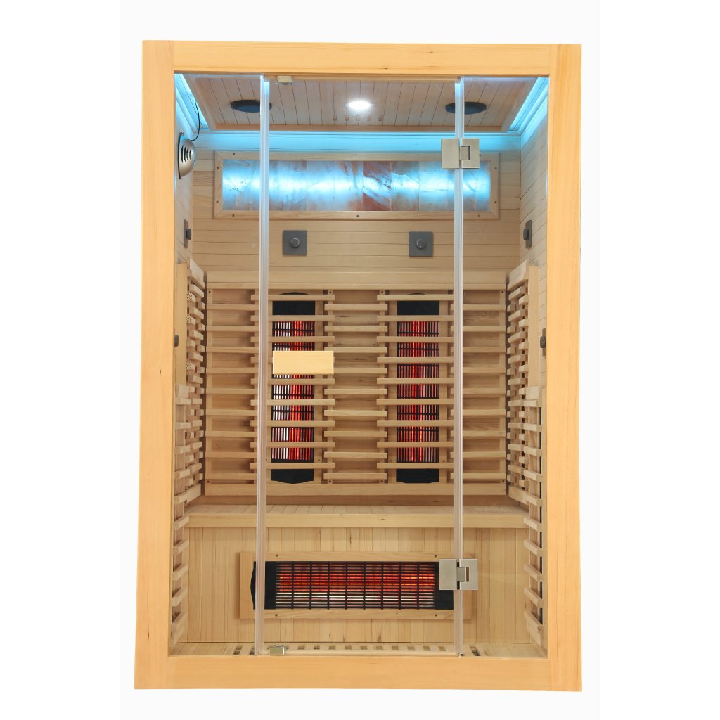 Infrasauna pro 2 osoby, 120x105x190 cm, 7x fullspektrální zářič RedGlass s možností výměny za zářiče Vitae 350W ( 2x záda, 4x boční, 1x lýtkový )+ 1x podlahový karbonový zářič, regulace výkonu zářičů, Hemlock, MP3, Bluetooth, Světelná terapie,Solná terapie ionizátor