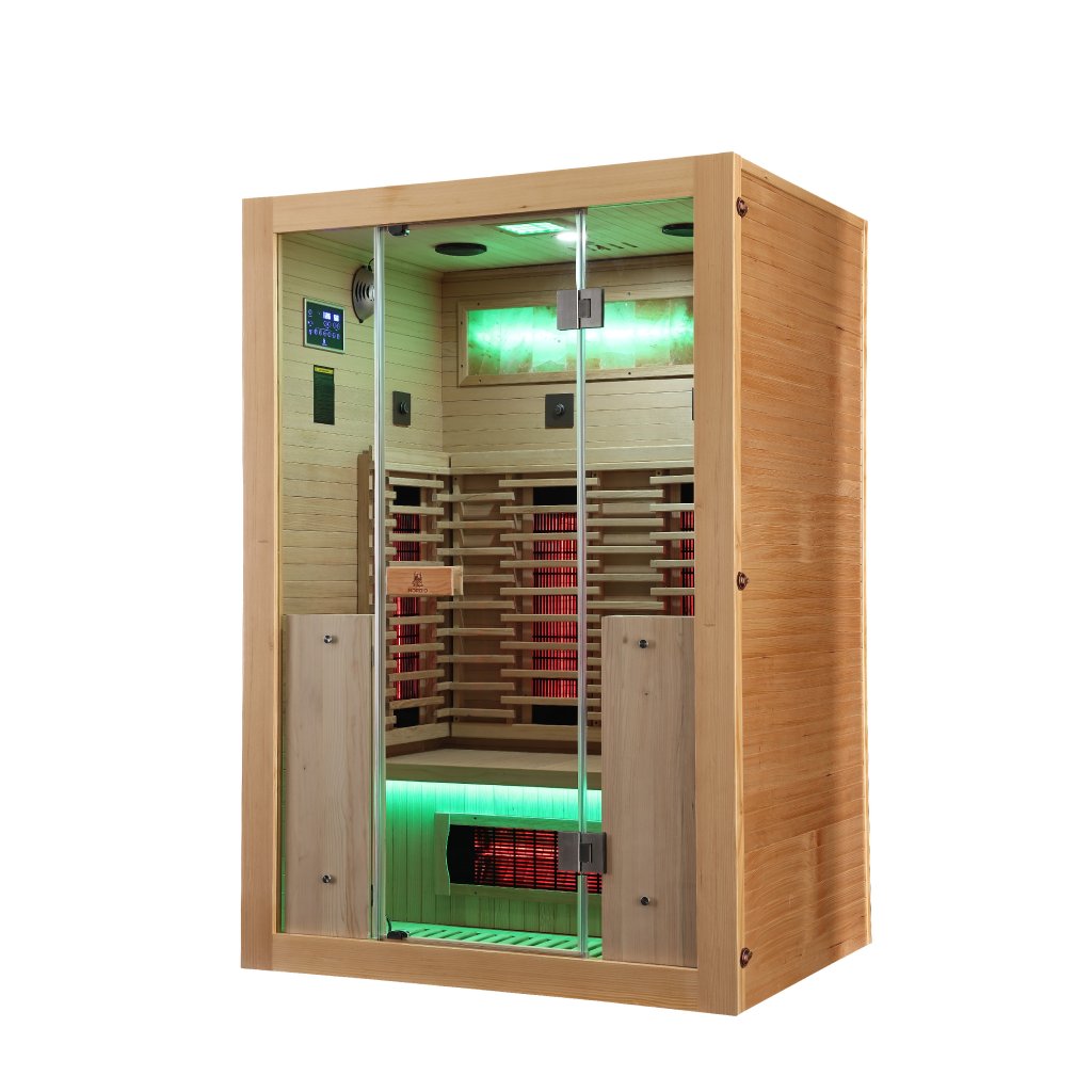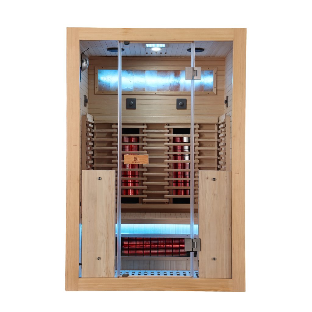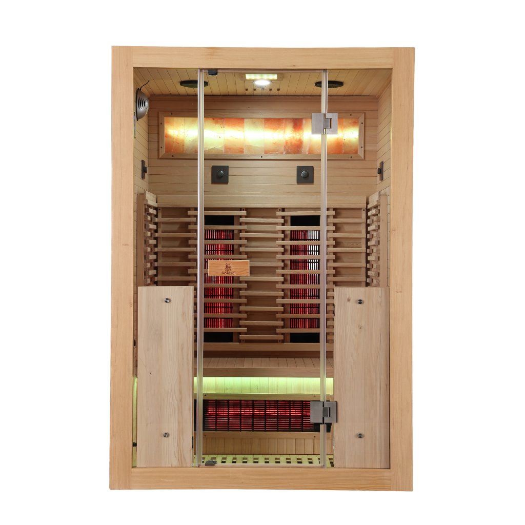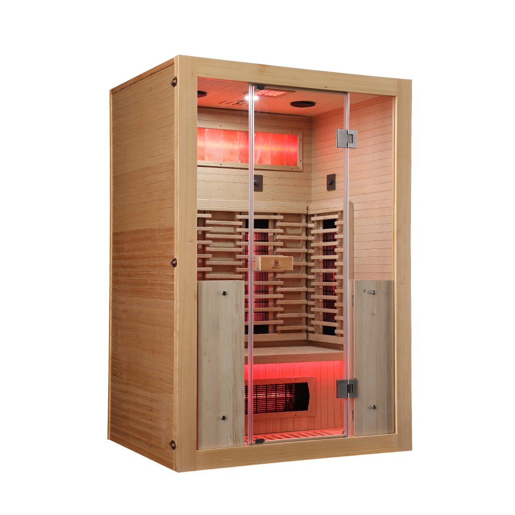 Infrasauna pro 2 osoby, 130x100x190 cm, 7x fullspektrální zářič RedGlass s možností výměny za zářiče Vitae 350W ( 2x záda, 2x boční, 2x přední, 1x lýtkový )+ 1x podlahový karbonový zářič, regulace výkonu zářičů, Hemlock, MP3, Bluetooth, Světelná terapie,Solná terapie ionizátor