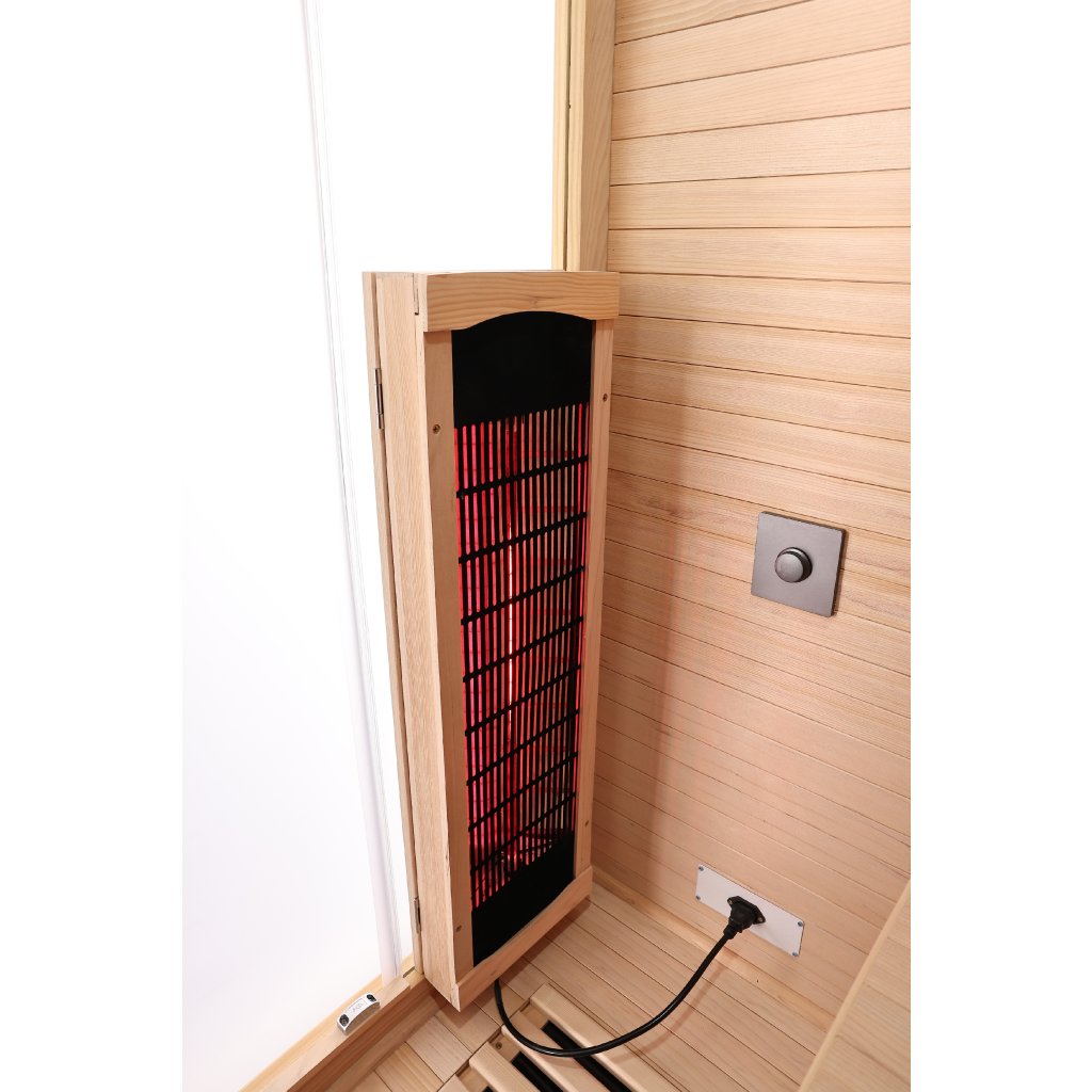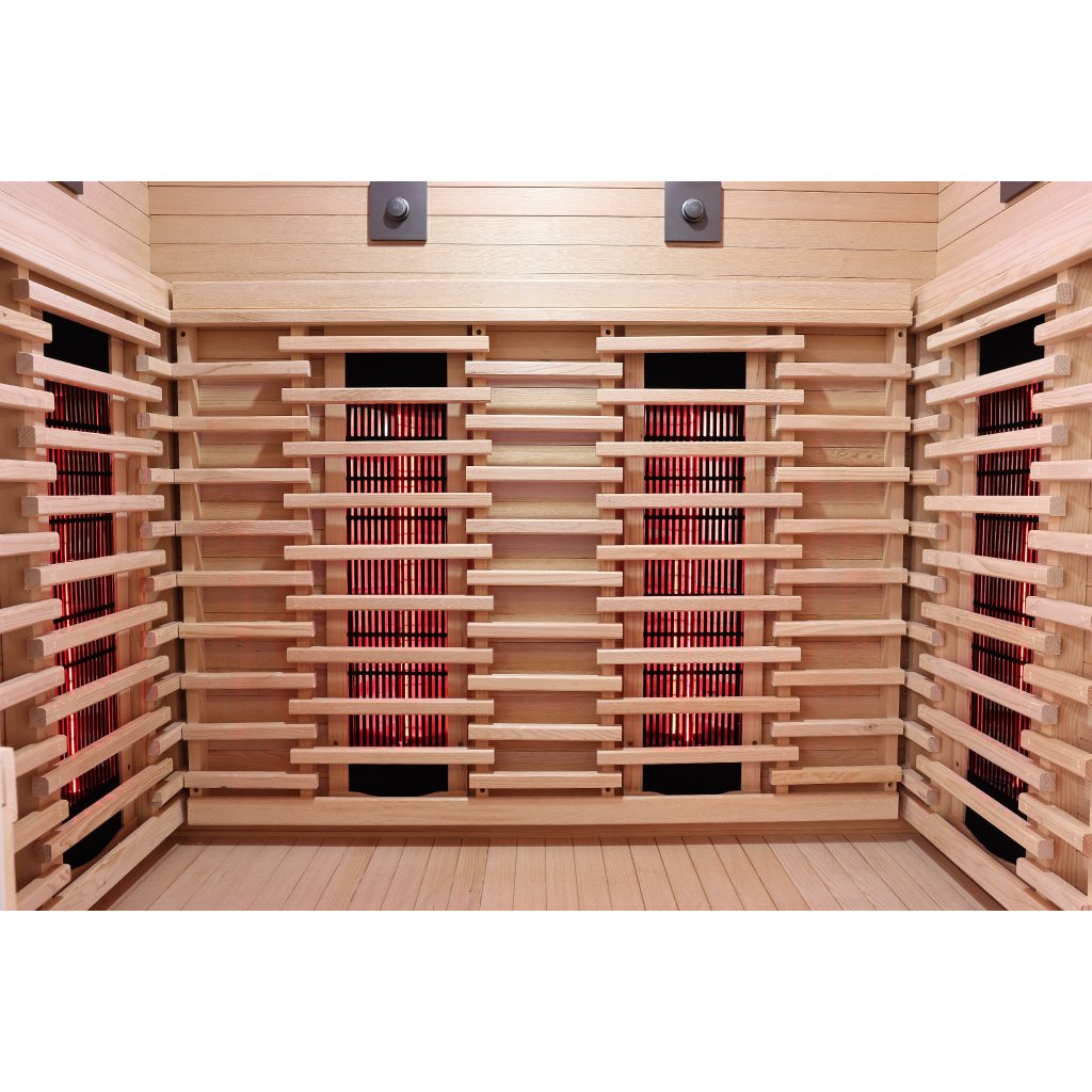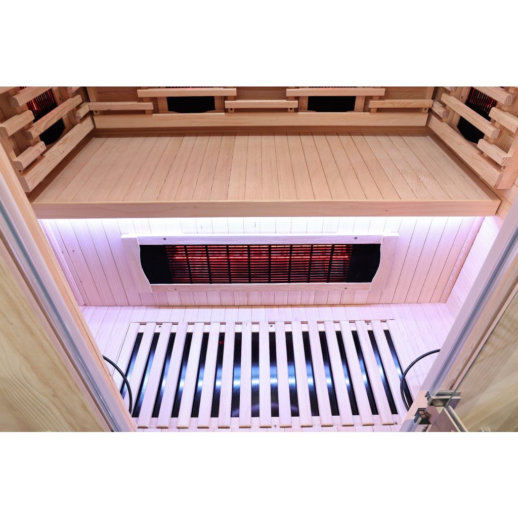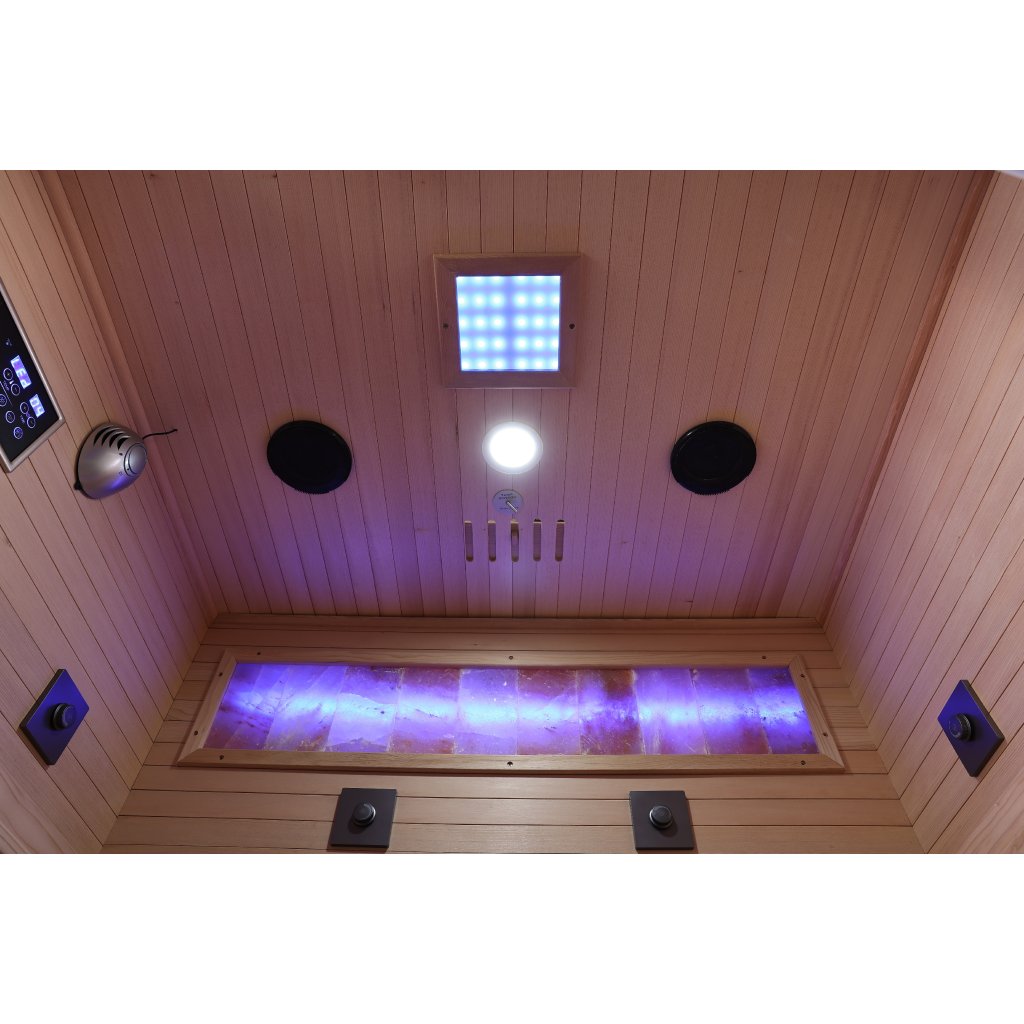 Infrasauna pro 2 osoby, 130x100x190 cm, 7x fullspektrální zářič RedGlass s možností výměny za zářiče Vitae 350W ( 2x záda, 2x boční, 2x přední, 1x lýtkový )+ 1x podlahový karbonový zářič, regulace výkonu zářičů, Hemlock, MP3, Bluetooth, Světelná terapie,Solná terapie ionizátor