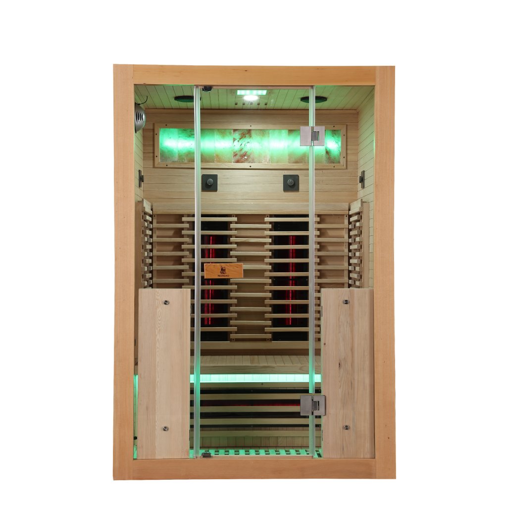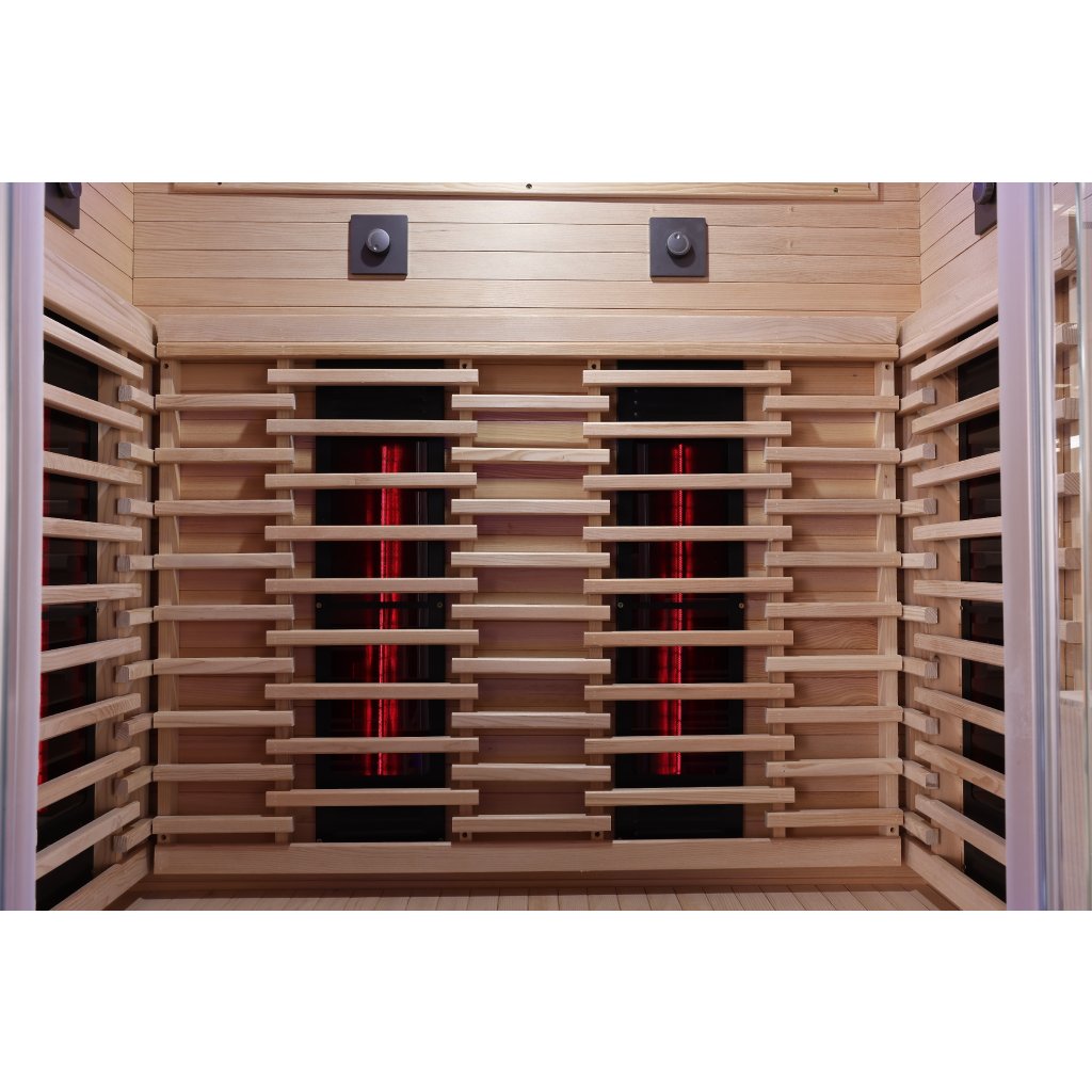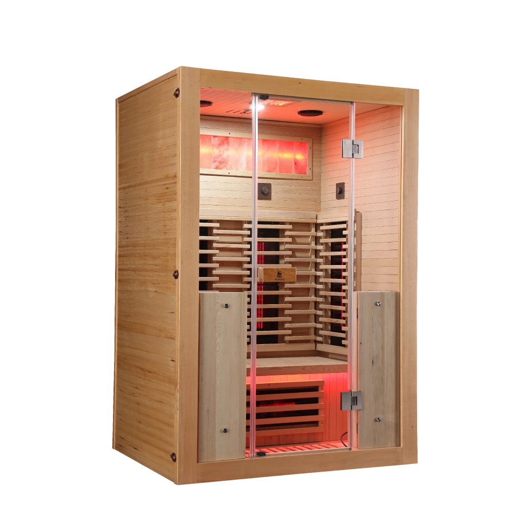 Infrasauna pro 2 osoby, 130x100x190 cm, 7x fullspektrální RedGlass s RLT filtrem pro terapii pomocí červeného světla s možností výměny za zářiče Vitae 350W ( 2x záda, 2x boční, 2x přední, 1x lýtkový ) a 1x podlahový karbonový zářič, regulace výkonu zářičů, Hemlock, světelná terapie, Solná terapie, MP3,bluetooth, ionizátor