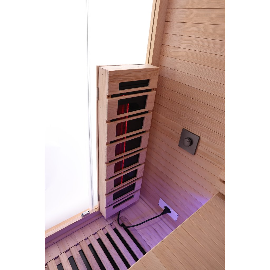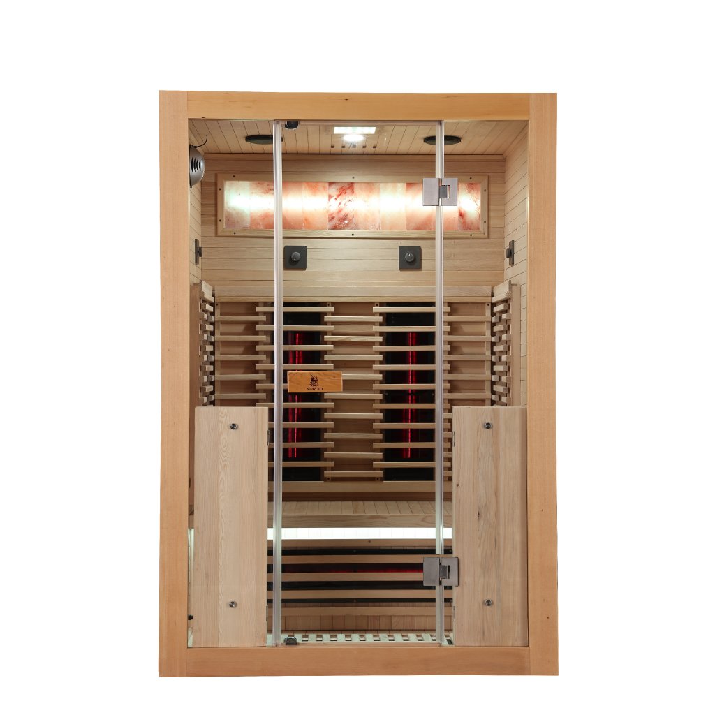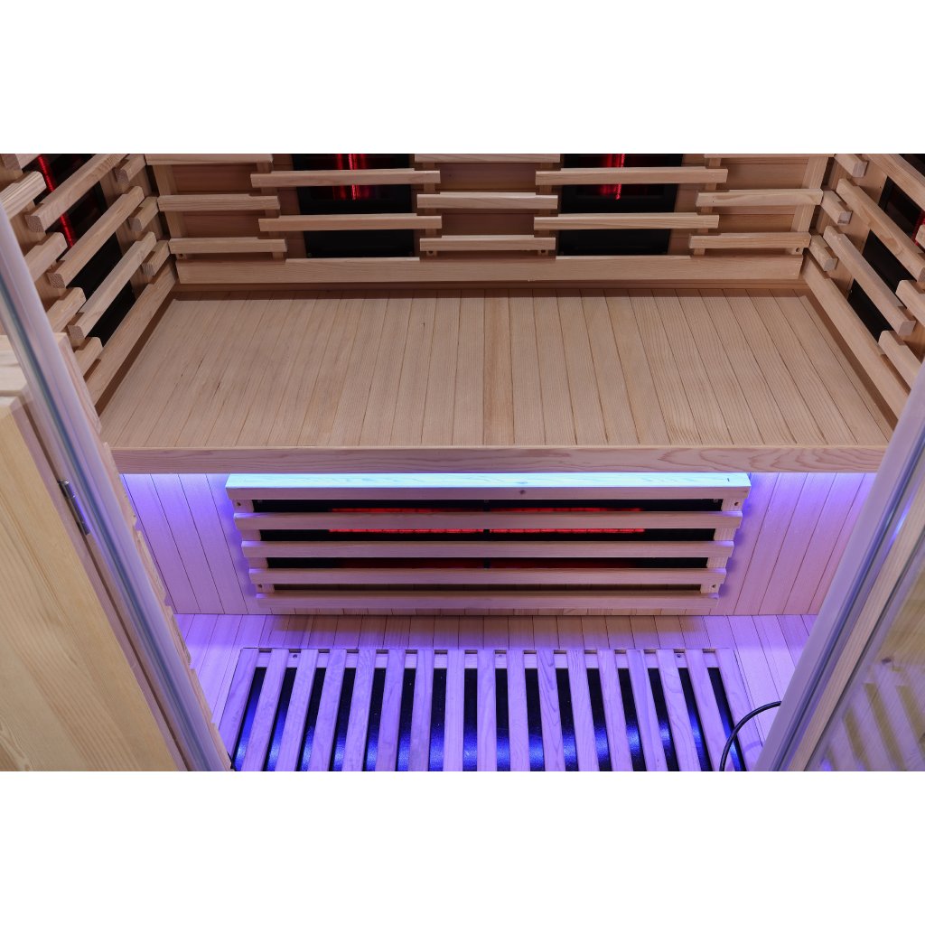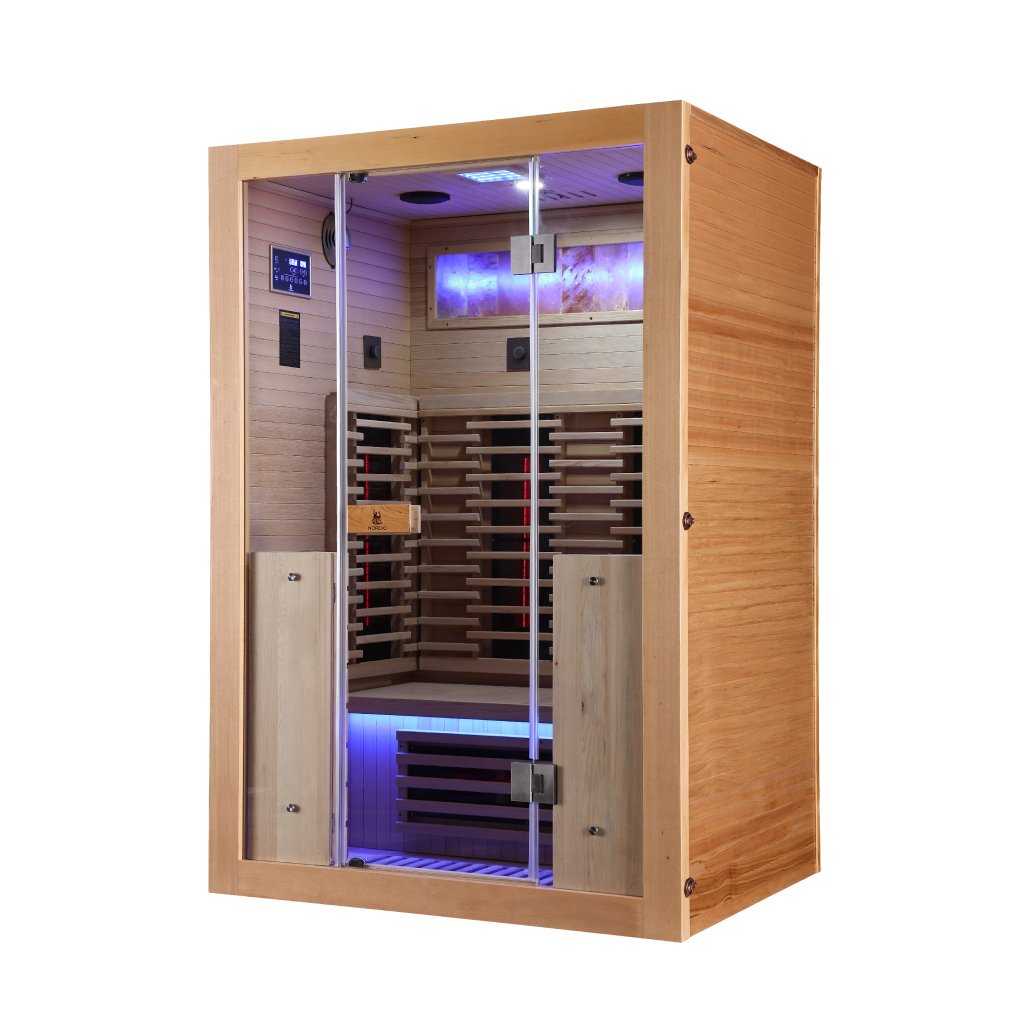 Infrasauna pro 2 osoby, 130x100x190 cm, 7x fullspektrální RedGlass s RLT filtrem pro terapii pomocí červeného světla s možností výměny za zářiče Vitae 350W ( 2x záda, 2x boční, 2x přední, 1x lýtkový ) a 1x podlahový karbonový zářič, regulace výkonu zářičů, Hemlock, světelná terapie, Solná terapie, MP3,bluetooth, ionizátor