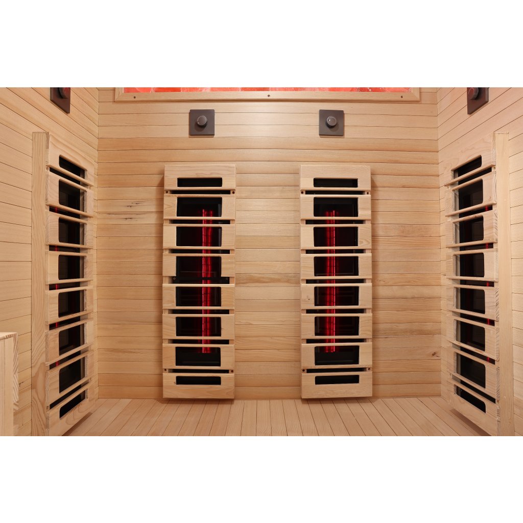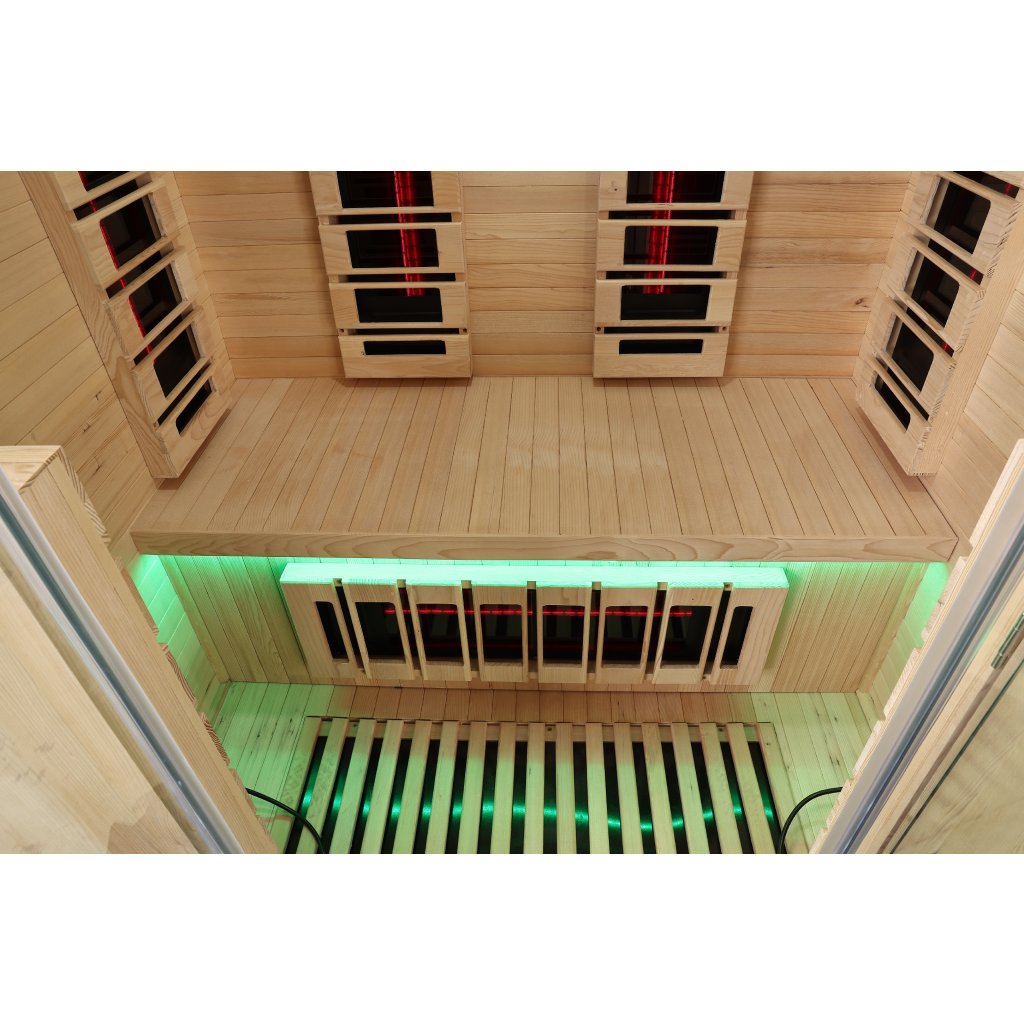 Infrasauna pro 2 osoby, 130x100x190 cm, 7x fullspektrální RedGlass s RLT filtrem pro terapii pomocí červeného světla s možností výměny za zářiče Vitae 350W ( 2x záda, 2x boční, 2x přední, 1x lýtkový ) a 1x podlahový karbonový zářič, regulace výkonu zářičů, Hemlock, světelná terapie, Solná terapie, MP3,bluetooth, ionizátor