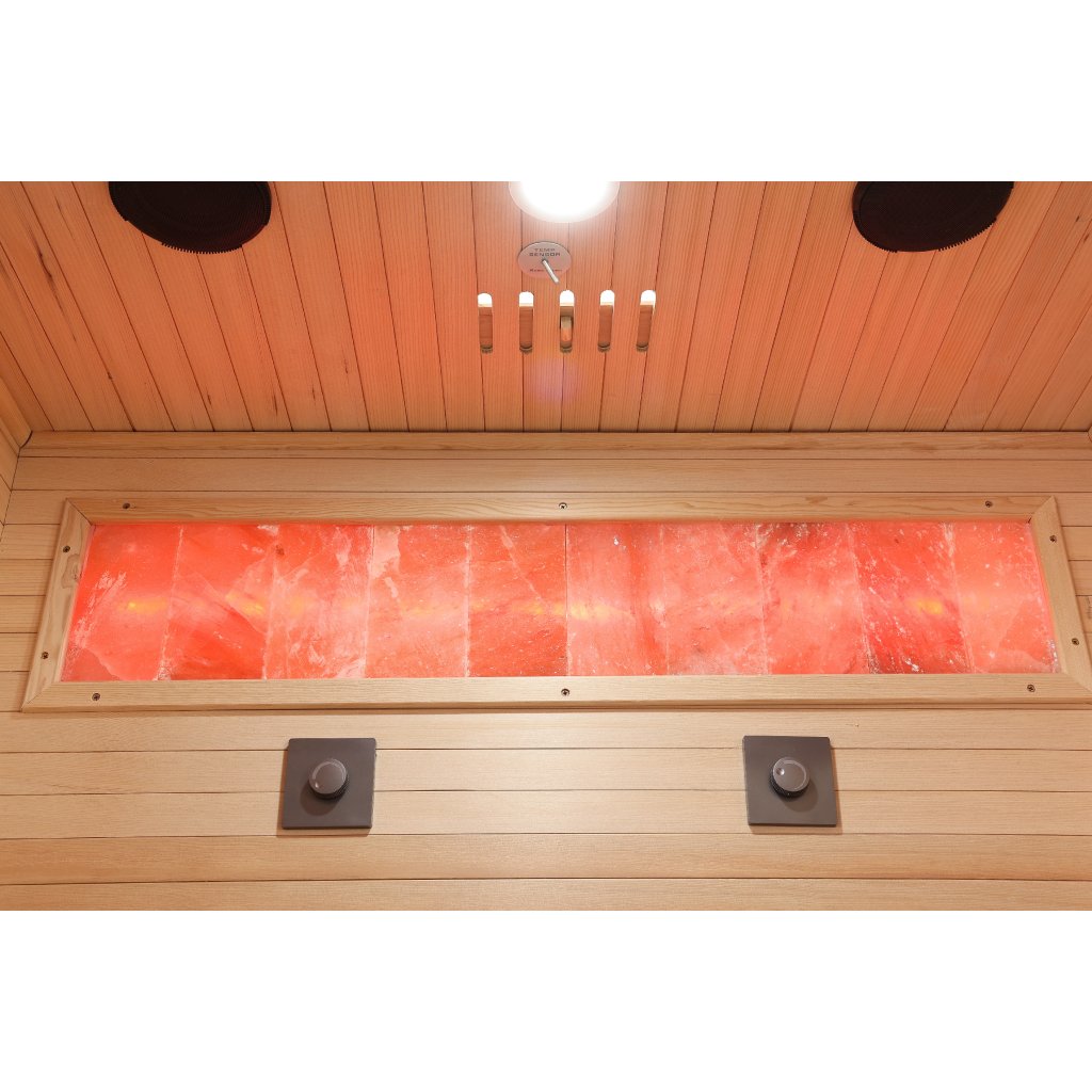 Solná terapie - panely himalájské soli zabudované ve stěně infrasauny působí příznivě na dýchací cesty a zlepšují kvalitu pokožky. Navíc po zapnutí jejího podsvícení Vás nadchne a evokuje onyxové stěny v luxusních domech