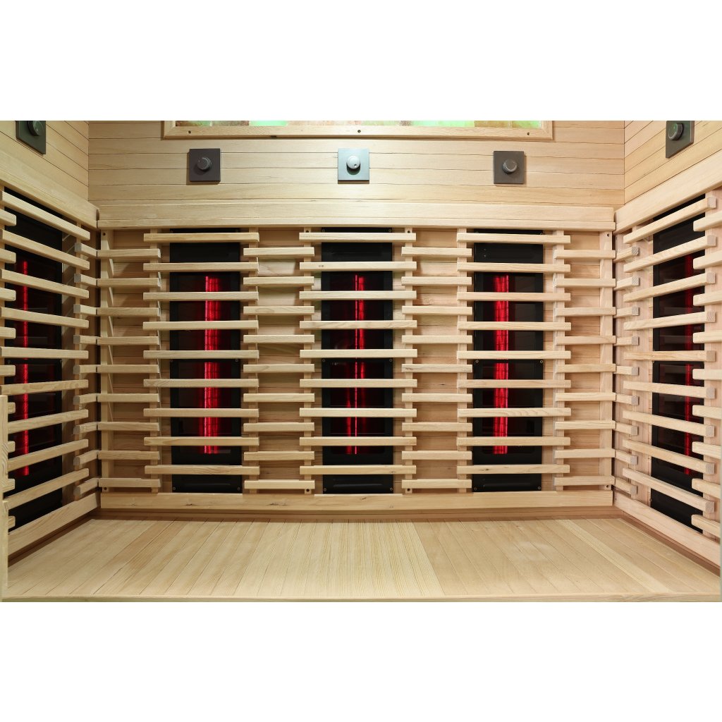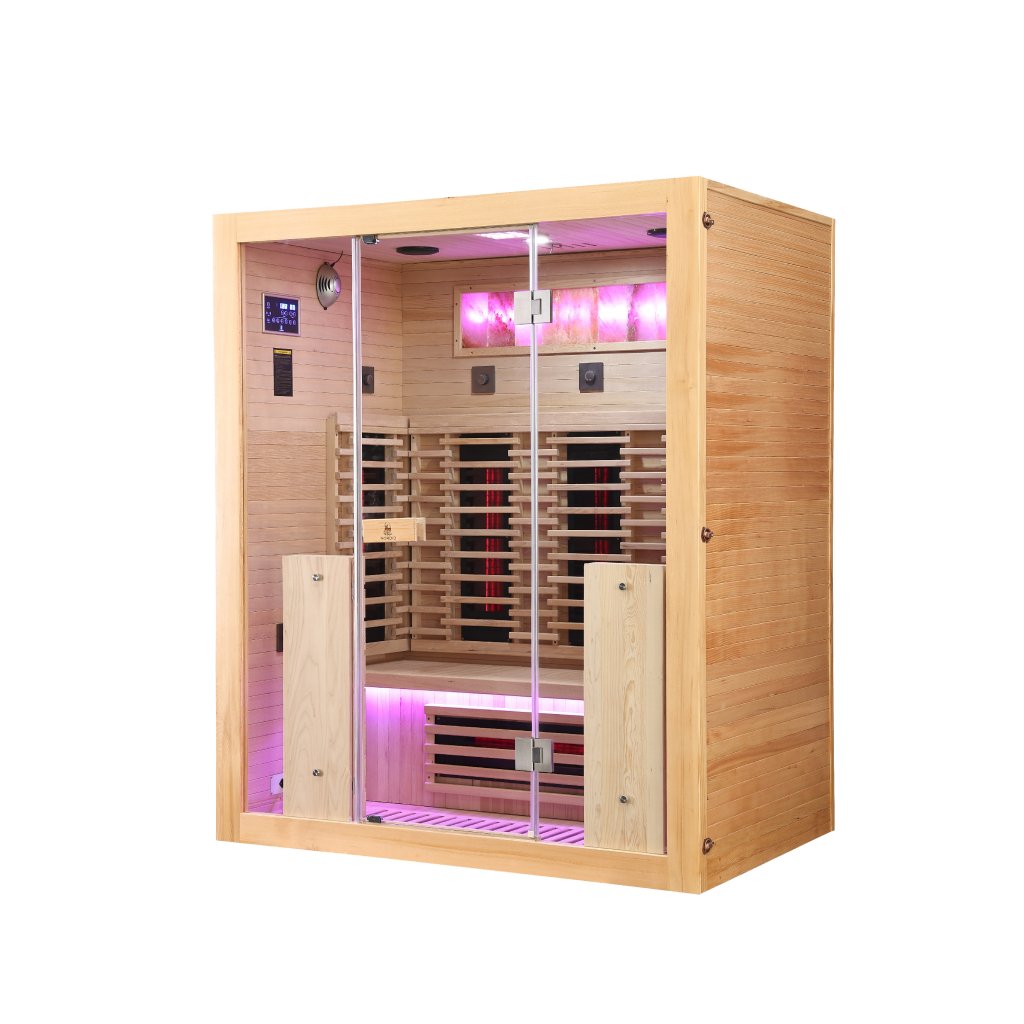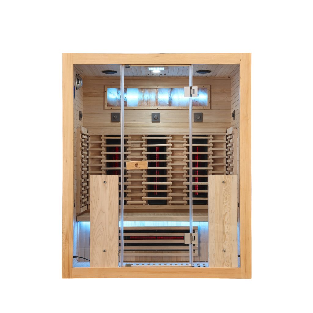 Infrasauna pro 3 osoby, 160x105x190 cm, 8x fullspektrální zářič RedGlass s možností výměny za zářiče Vitae 350W ( 3x záda, 2x boční, 2x přední, 1x lýtkový ) + 1x podlahový karbonový zářič, regulace výkonu zářičů, Hemlock, MP3, Světelná terapie, Solná Terapie, Ionizátor