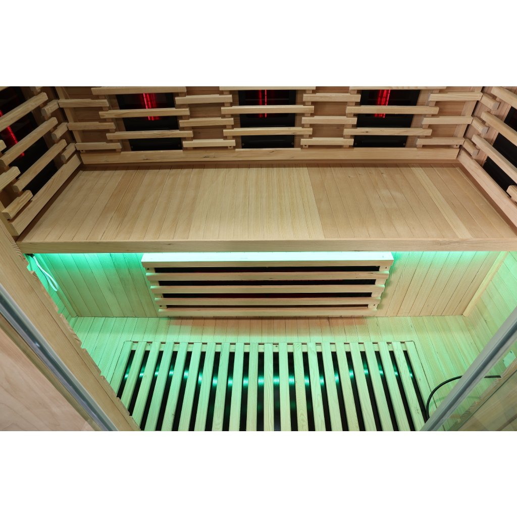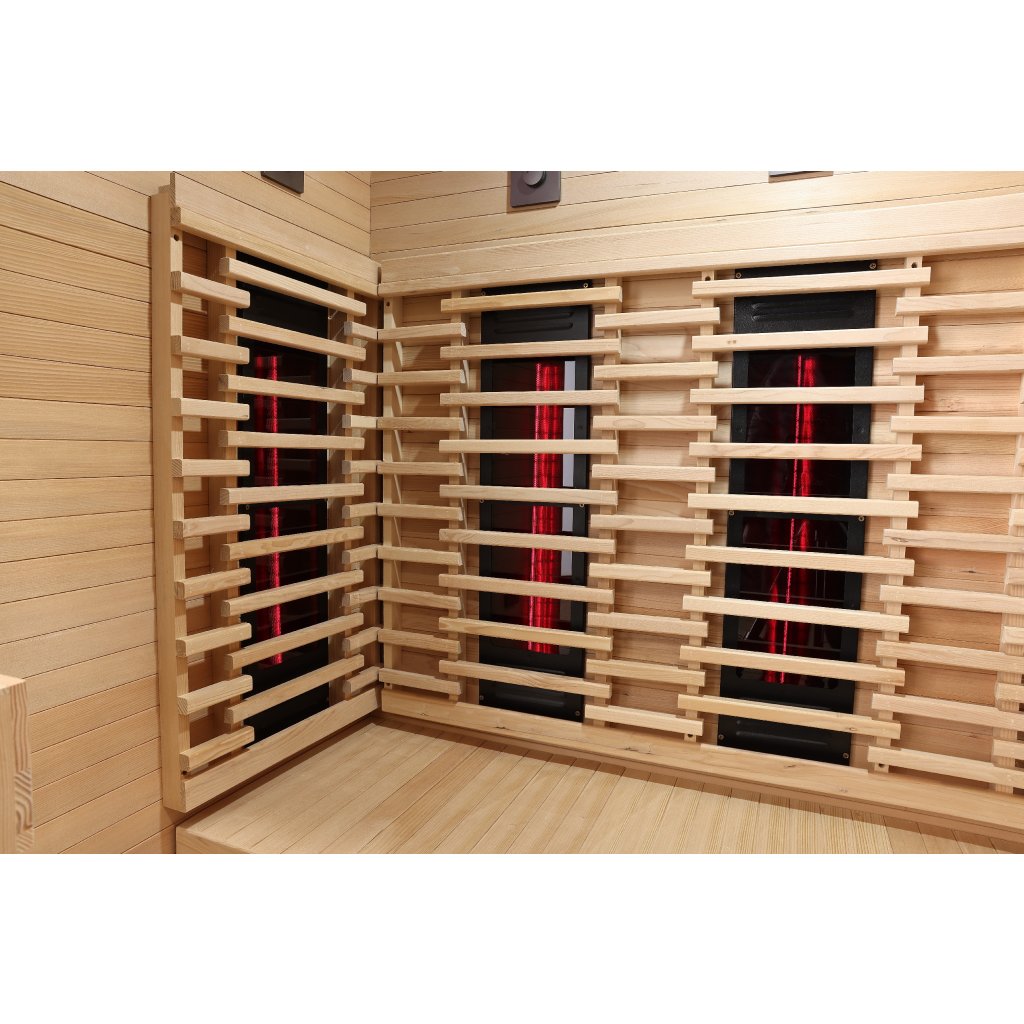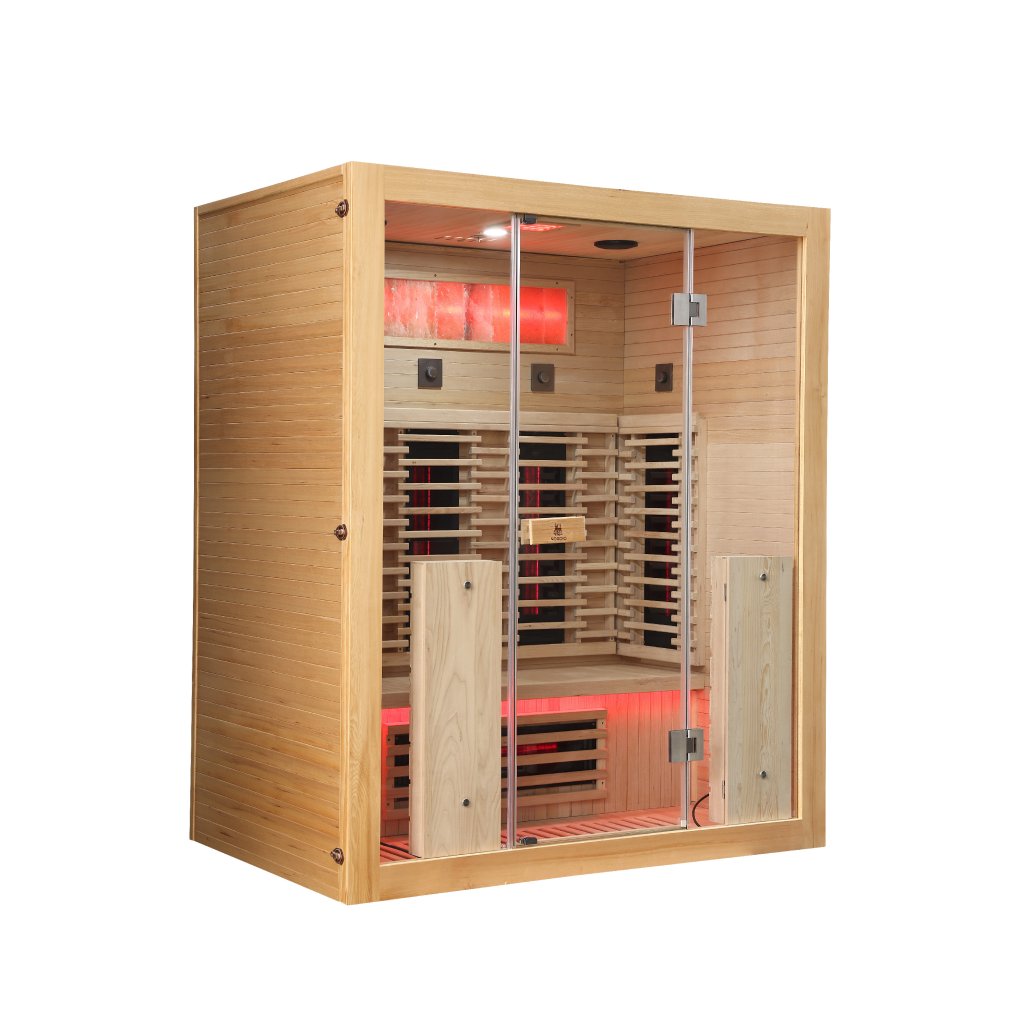 Infrasauna pro 3 osoby, 160x105x190 cm, 8x fullspektrální zářič RedGlass s možností výměny za zářiče Vitae 350W ( 3x záda, 2x boční, 2x přední, 1x lýtkový ) + 1x podlahový karbonový zářič, regulace výkonu zářičů, Hemlock, MP3, Světelná terapie, Solná Terapie, Ionizátor