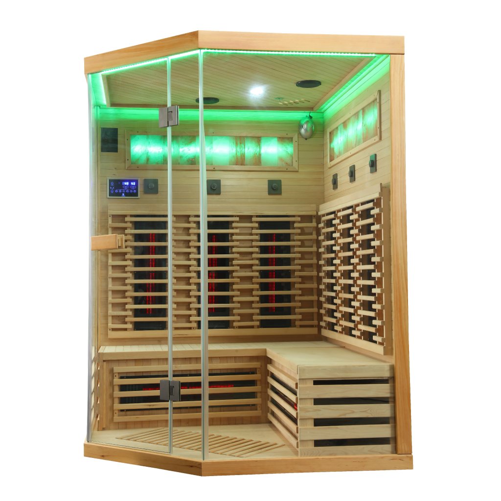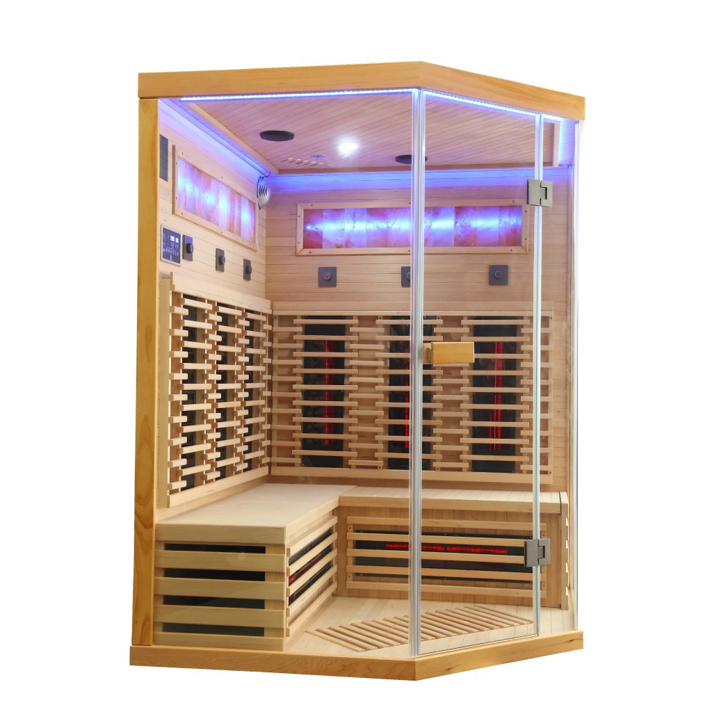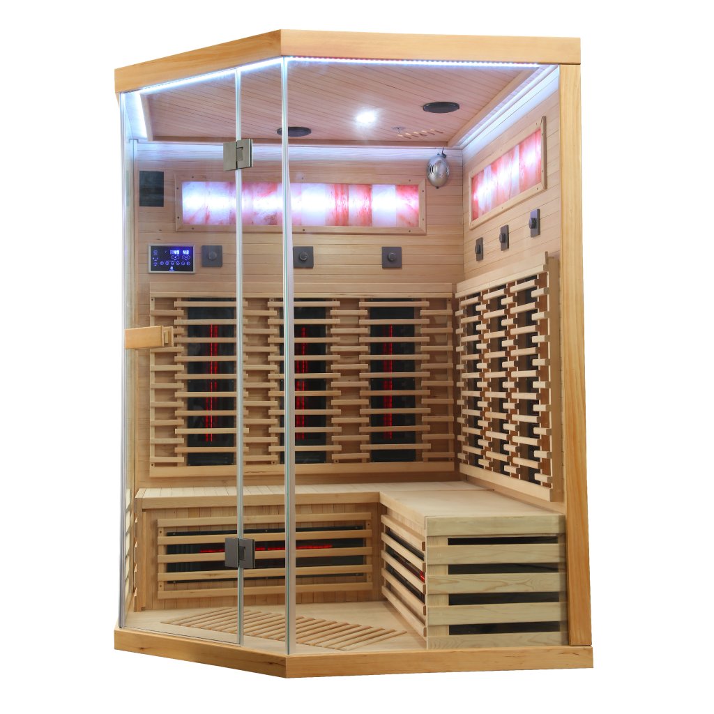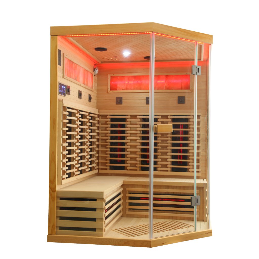 Infrasauna pro 3-4 osoby, 150x98x74x98x150 cm, 8x fullspektrální zářič RedGlass s RLT filtrem pro terapii pomocí červeného světla s možností výměny za zářiče Vitae 350W ( 3+3 záda a 2x lýtkový ), 1x podlahový karbonový zářič, Hemlock, regulace výkonu zářičů, MP3, Bluetooth, Světelná terapie, Solná Terapie, ionizátor