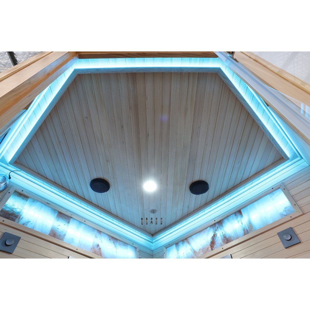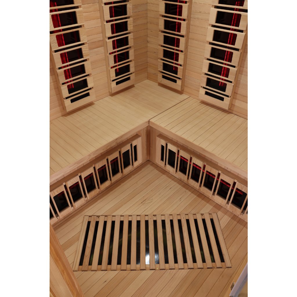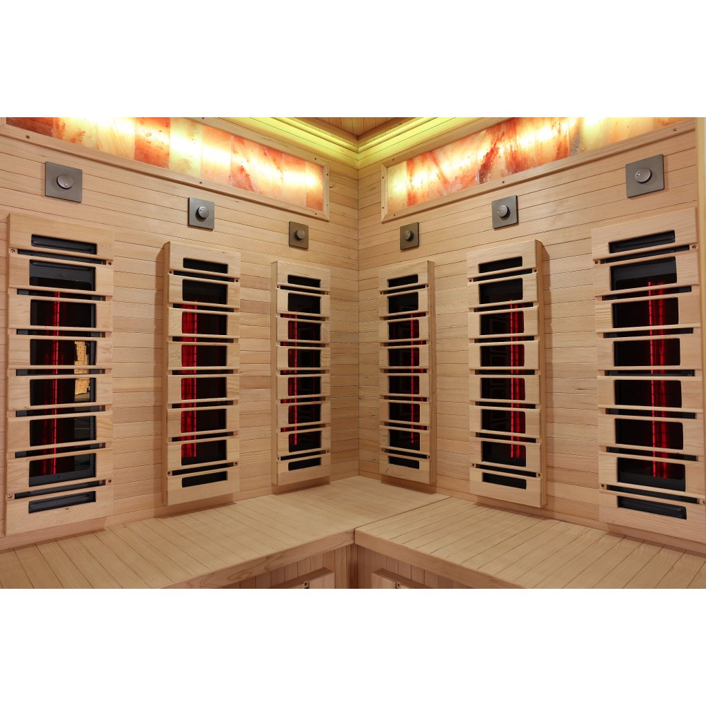 Infrasauna pro 3-4 osoby, 150x98x74x98x150 cm, 8x fullspektrální zářič RedGlass s RLT filtrem pro terapii pomocí červeného světla s možností výměny za zářiče Vitae 350W ( 3+3 záda a 2x lýtkový ), 1x podlahový karbonový zářič, Hemlock, regulace výkonu zářičů, MP3, Bluetooth, Světelná terapie, Solná Terapie, ionizátor