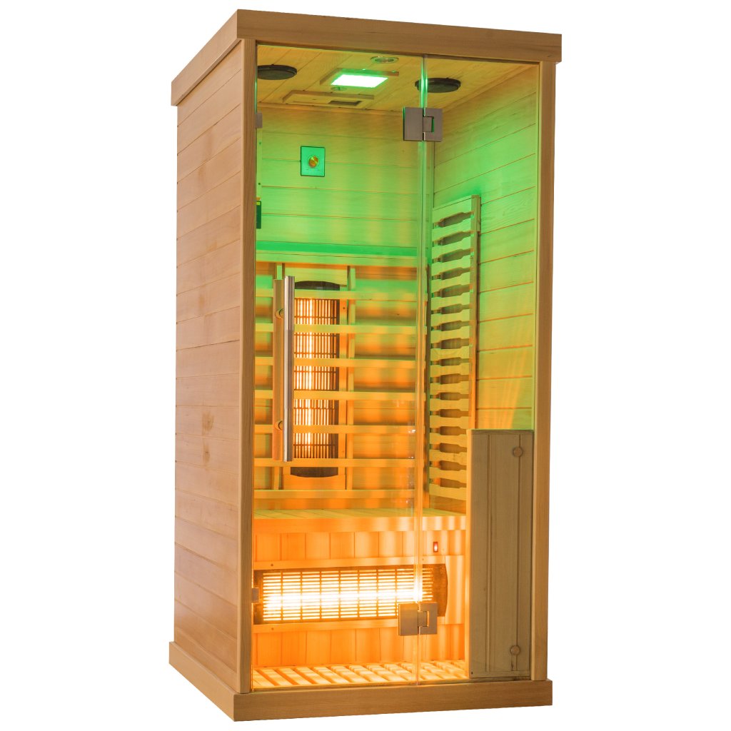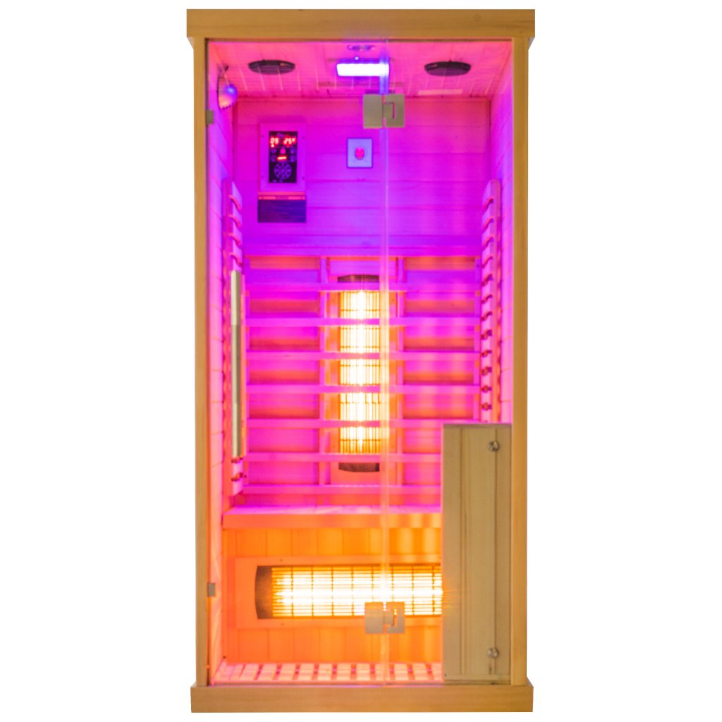Infrasauna pro 1 osobu, 93x93x190 cm, 3x fullspektrální zářič RedLight+ ( 1x záda, 1x přední, 1x lýtkový ), 2x boční karbonový zářič, 1x podlahový karbonový zářič, regulace výkonu zářičů, Hemlock, MP3, Světelná terapie, ionizátor