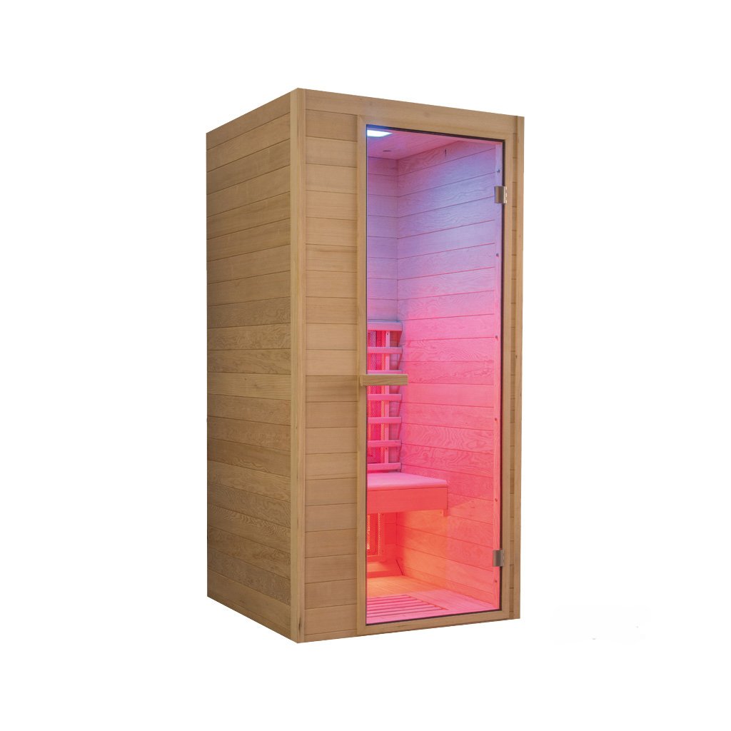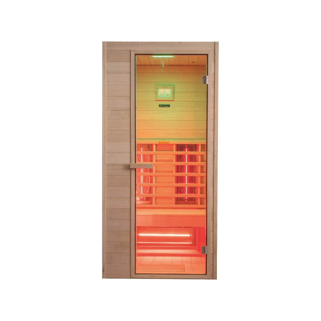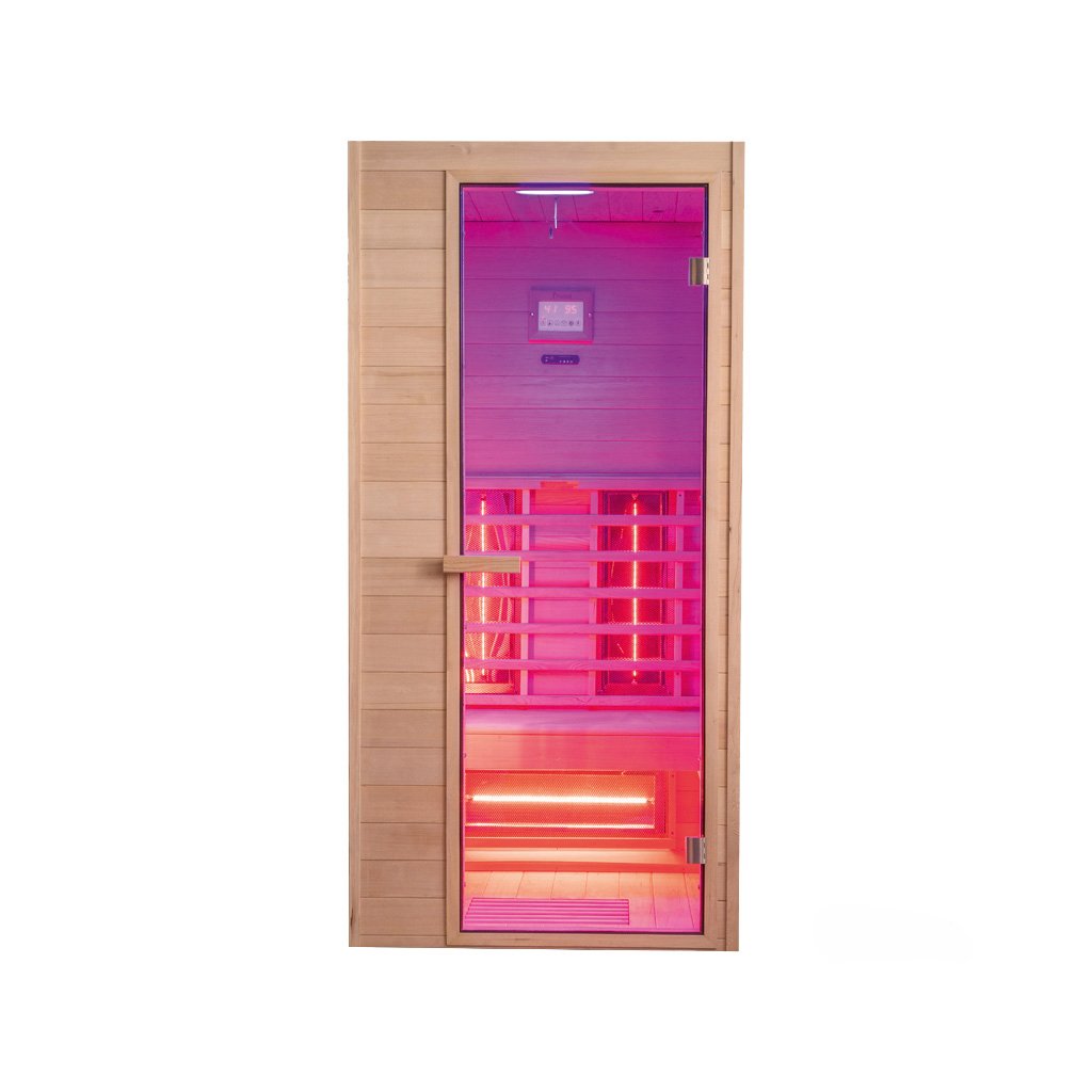 Infrasauna pro 1 osobu, 90x94x190 cm, 4x fullspektrální RedLight+ zářič ( 2x záda, 1x přední, 1x lýtkový ), 1x podlahový karbonový zářič, regulace výkonu zářičů, Hemlock, MP3, světelná terapie, ionizátor