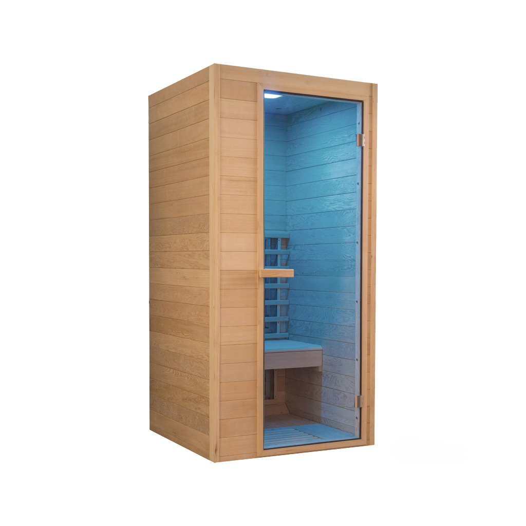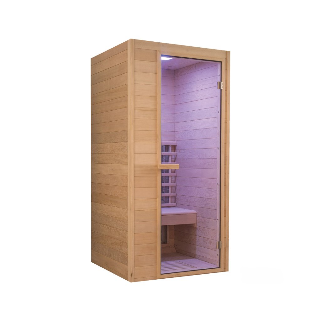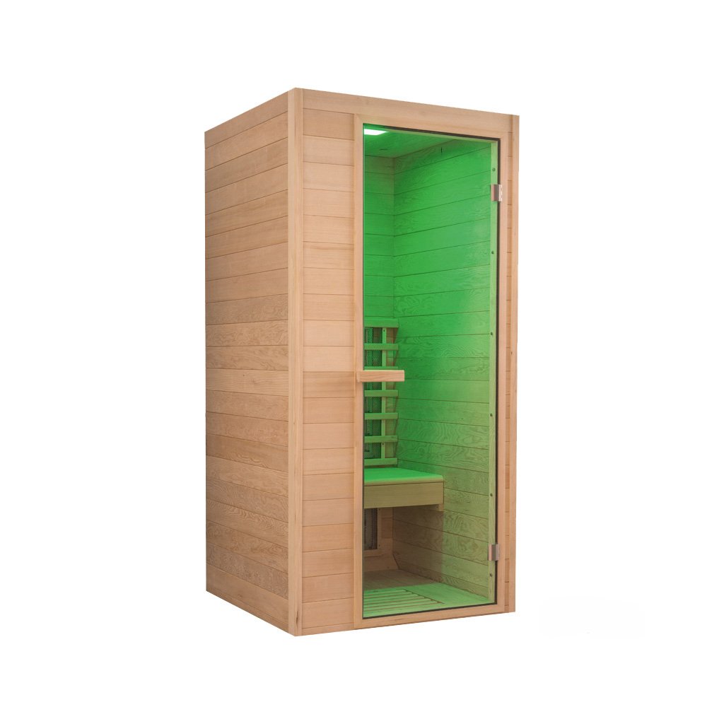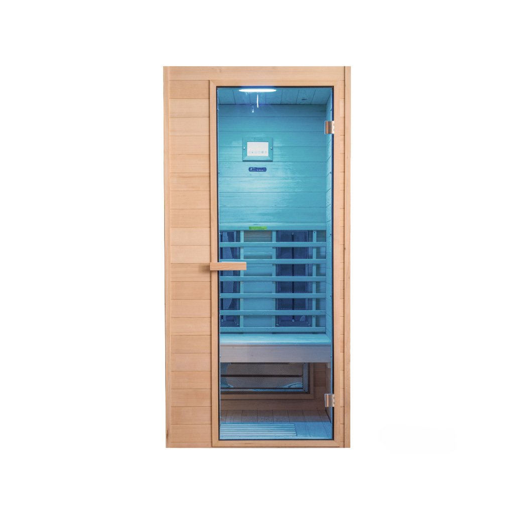 Infrasauna pro 1 osobu, 90x94x190 cm, 4x fullspektrální RedLight+ zářič ( 2x záda, 1x přední, 1x lýtkový ), 1x podlahový karbonový zářič, regulace výkonu zářičů, Hemlock, MP3, světelná terapie, ionizátor