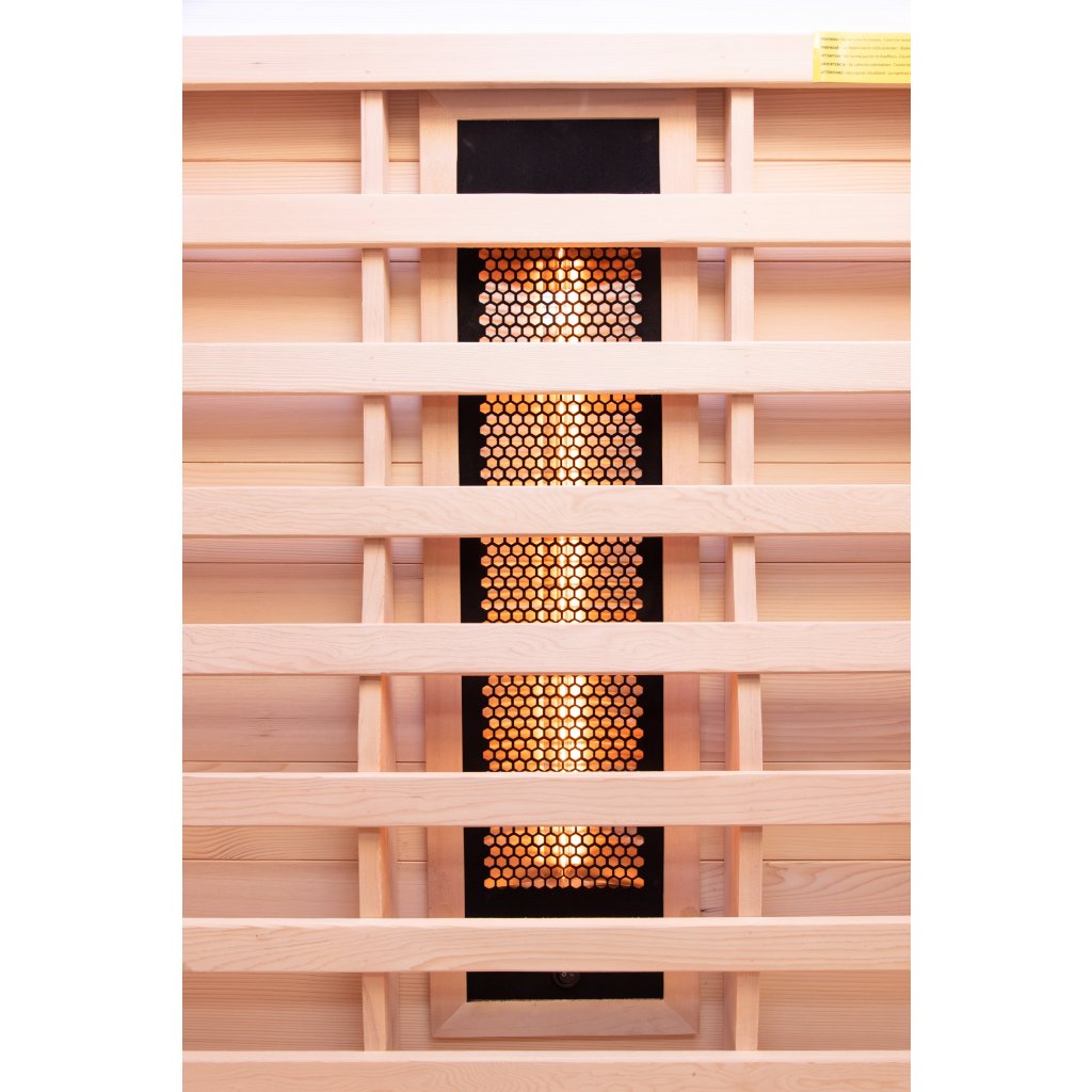 Infrasauna pro 1 osobu, 90x90x190 cm, 4x fullspektrální zářič RedGlass s možností výměny za zářiče Vitae 350W ( 1x záda, 2x boční, 1x lýtkový ), 2x boční karbonový zářič, 1x podlahový karbonový zářič, zónová regulace výkonu zářičů, Hemlock, MP3, Bluetooth, Světelná terapie, ionizátor