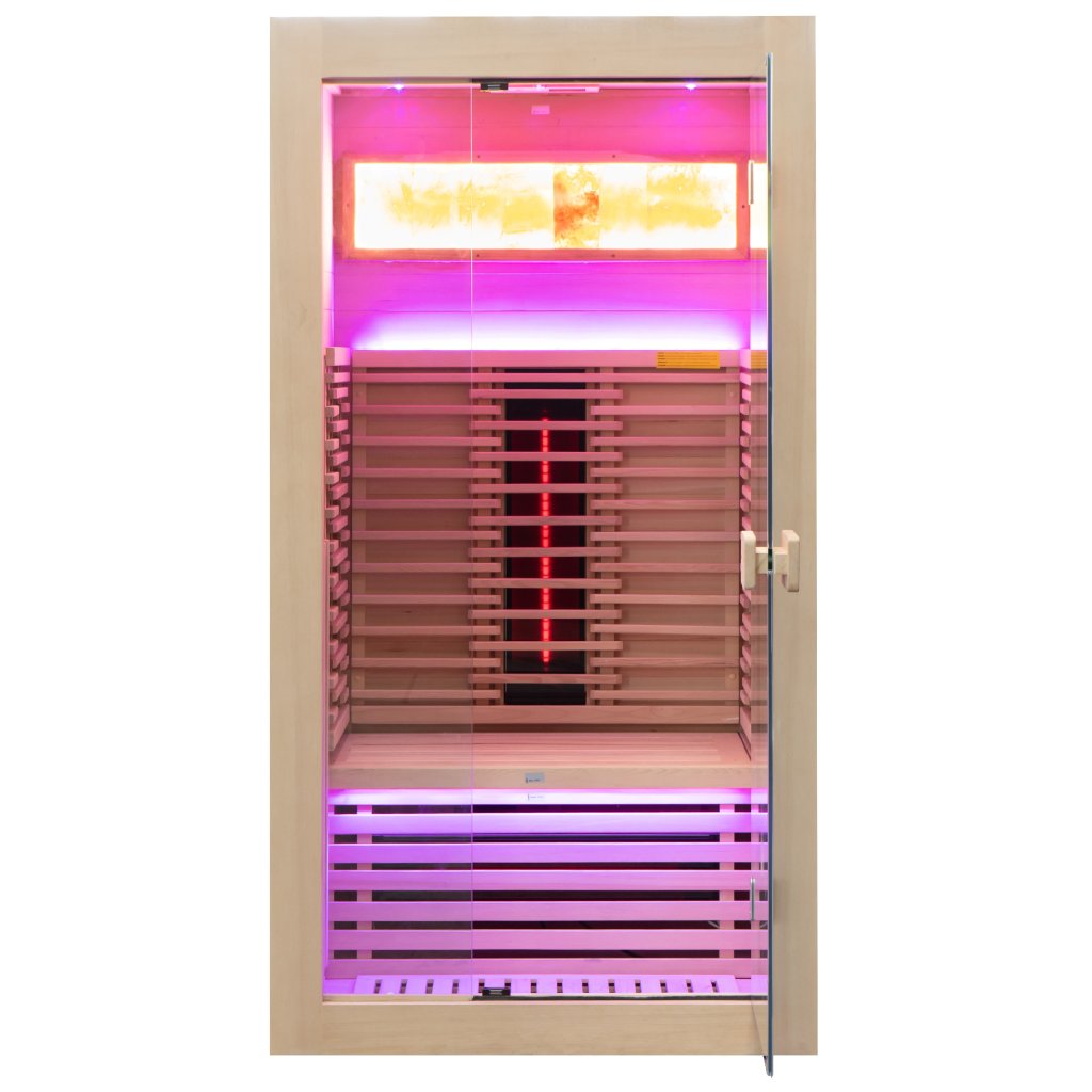 Infrasauna pro 1 osobu, 105x95x200 cm, 6x fullspektrální Vitae s RLT filtrem pro terapii pomocí červeného světla ( 1x záda, 2x boční, 2x přední, 1x lýtkový ) a 1x podlahový karbonový zářič, zónová regulace výkonu, Hemlock, světelná terapie, MP3,bluetooth, ionizátor, solná terapie