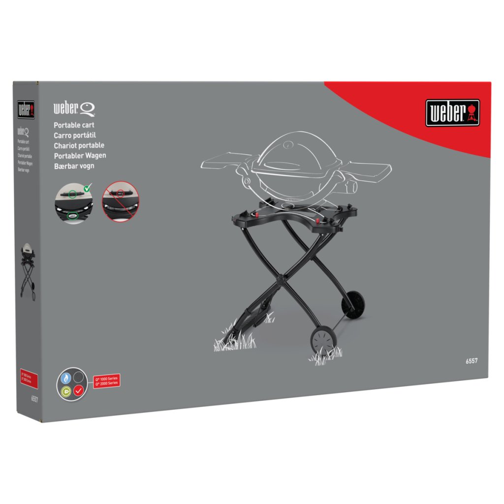 S vozíkem je gril stabilní samostatnou jednotkou. Skládací vozík slouží jako podpora grilu a pro jeho snadnou přepravu. Pro modely Q od roku 2014.