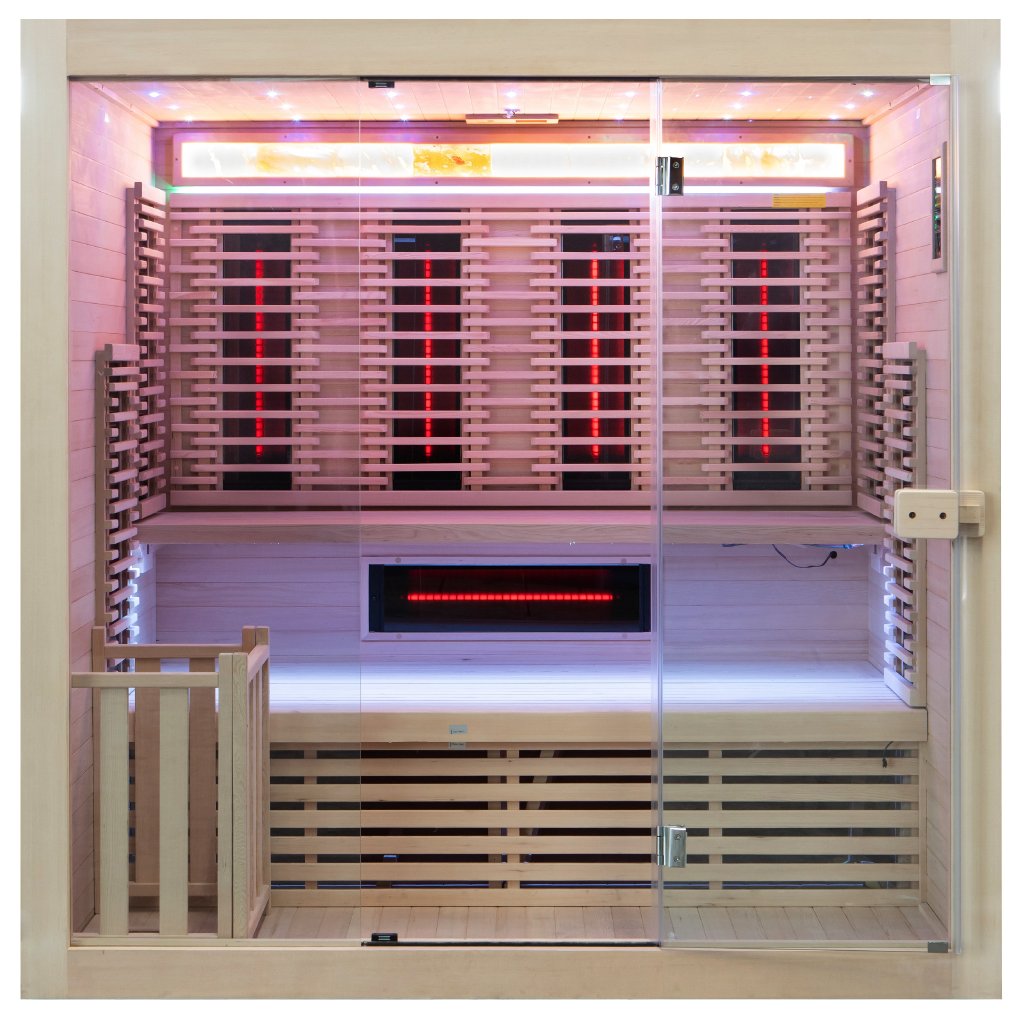 Kombinovaná sauna pro 4 osoby, 200x150x200 cm, Hemlock dřevo, 9x fullspektrální Vitae s RLT filtrem pro terapii pomocí červeného světla ( 4 záda, 4x boční, 1x lýtkový ), zónová regulace výkonu, světelná terapie, MP3,ionizátor.