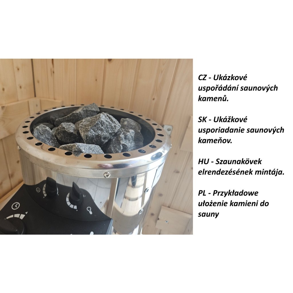 - obsahem balení je 18 kg saunových kamenů (v balení je výrazně větší množství kamenů, než je nutné pro prvotní naplnění kamen, zbytek je určen pro budoucí výměnu rozpraskaných kamenů)