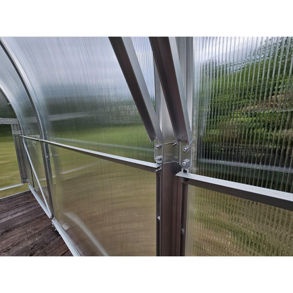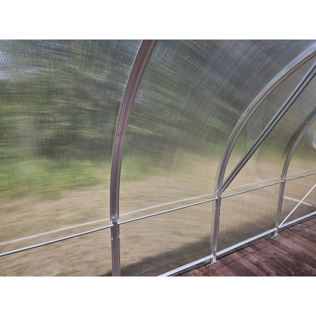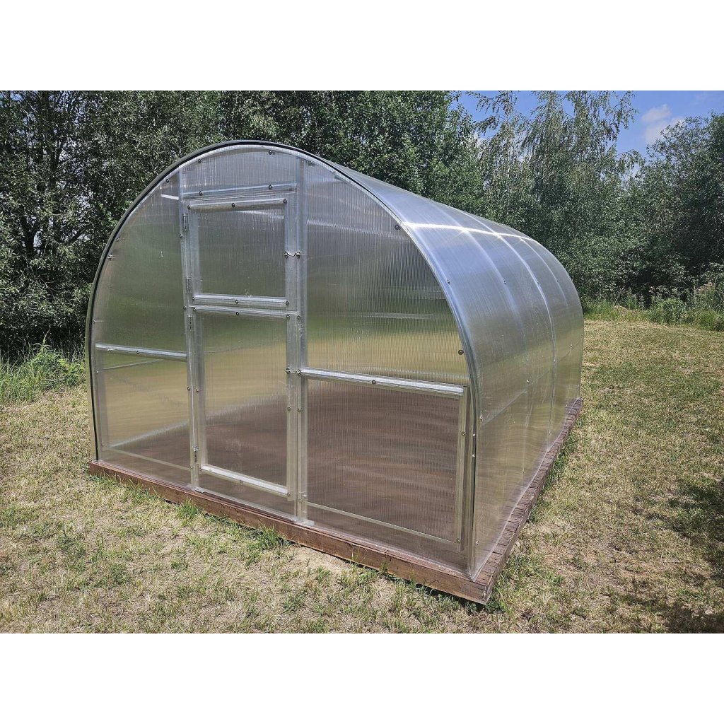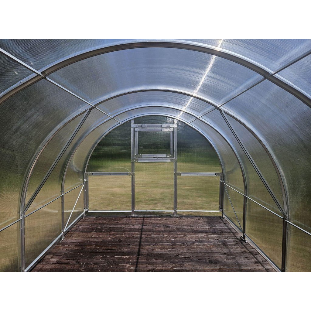 šířka 2,9 m, délky cca 4 / 6 / 8 m, masivní 1 mm silný a 65 mm široký eloxovaný hliníkový profil, rozteč oblouků 100 cm, vnitřní podpěry obloukové konstrukce, dvojité dveře vpředu, ventilační okno vzadu, prosklení nutno vyřezat z dodaných polykarbonátových desek |