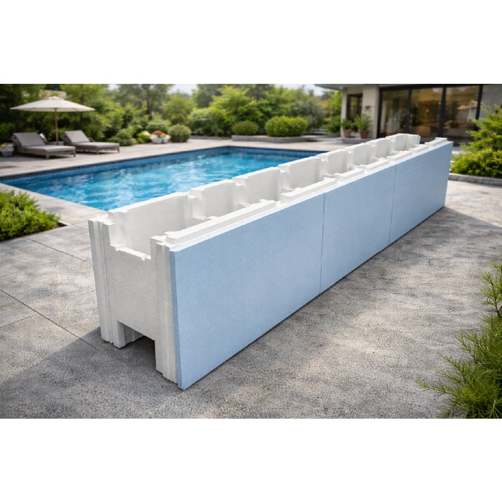 Velmi vysoká hustota na straně tvárnice: 80 kg/m3 - pomáhá odolávat tlakům na stěnách bazénu